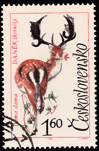 Ebenfalls aus der Tschechoslowakei kommt diese Marke (MiNr 1444) mit einem Rehbock (Capreolus capreolus).