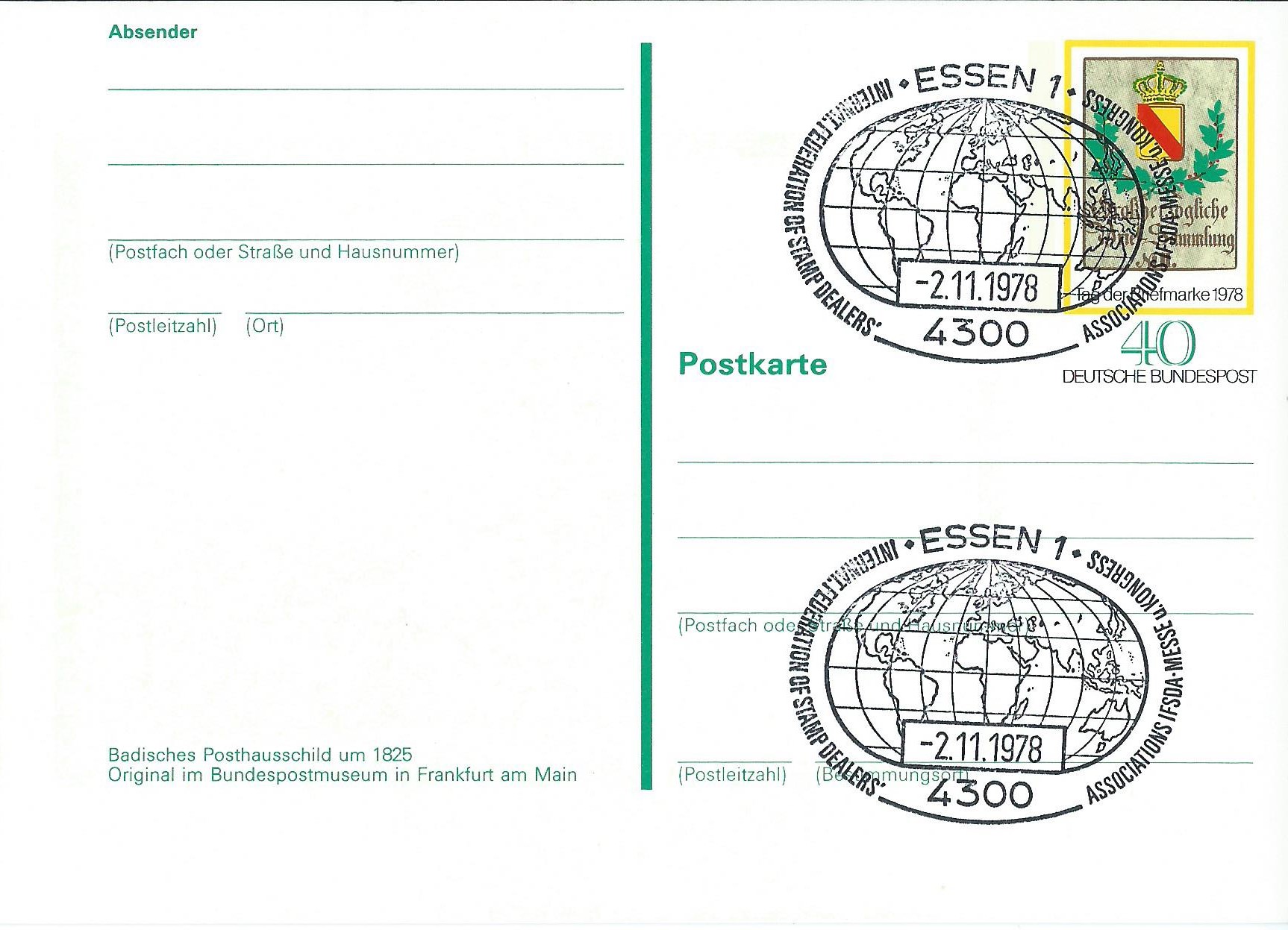 Zuerst möchte ich die Postkarte mit der 40 Pf-Ausgabe zum Tag der Briefmarke 1978 vorstellen. Sie zeigt als Wertstempel die bildgleiche Marke mit dem Badischen Posthausschild. Im Michel-Ganzsachenkatalog wird sie als PSo 5 gelistet. Überwiegend wurde sie von Sammlern als Sonderstempel-Vorlage genutzt, das soll auch im Anschluss dokumentiert werden. Es gibt sie aber auch als Bedarfsverwendung, wie im folgenden ersten Bild zu sehen ist. Hier wurde sie für ein Preisausschreiben genutzt und mit dem Maschinenstempel Essen vom 13.12.78 gestempelt.