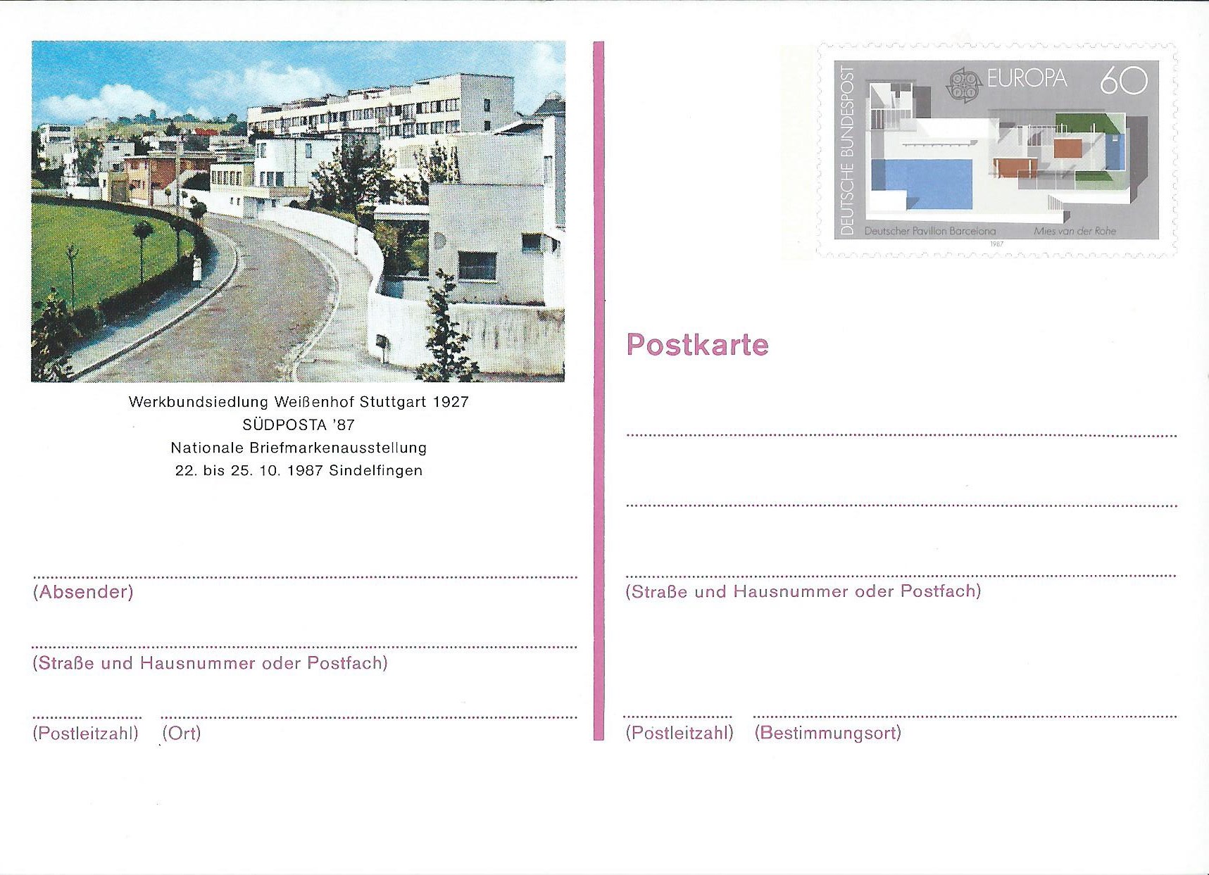 Die nächste Postkarte trägt das Motiv der Europa-Marke 1987 nebst Zudruck zur Südposta ´87. Sie ist ungebraucht und hat die Michel-Nummer PSo 14.