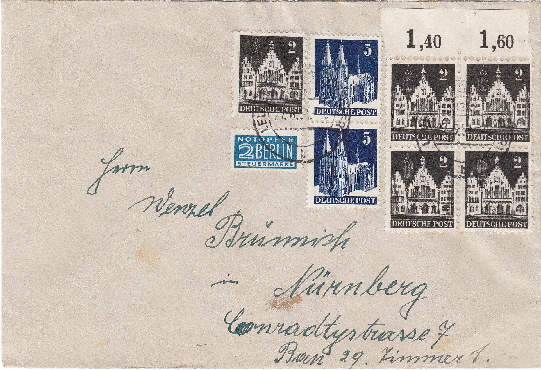 Reihenwertzähler ''4,00'' Typ Westermann bei der Michel 84, hier am 24.07.1949 portogerecht als EF auf Fernbrief. Zusätzlich verklebt wurde die zu dieser Zeit obligatorische Zwangszuschlagsmarke Notopfer.