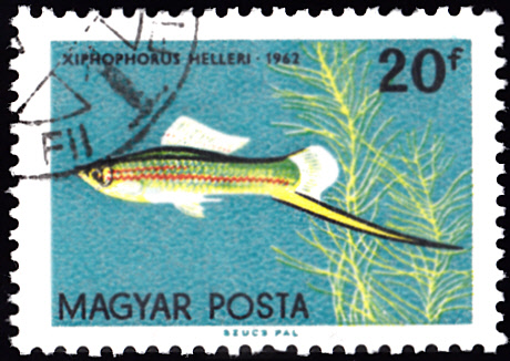 Auf einer Marke aus Ungarn (MiNr 1820 A) ist ein Schwertträger (Xiphophorus hellerii) dargestellt. Michel nennt ihn Grüner Schwertträger (Xiphophorus helleri).