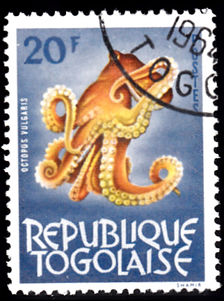 Auf einer Marke aus Togo (MiNr 395) ist ein Gemeiner Krake (Octopus vulgaris) zu sehen, Michel nennt ihn Gemeiner Oktopus (Octopus vulgaris).