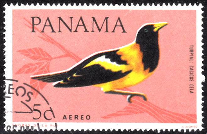 Auf dieser Marke aus Panama (MiNr 848 A) wird ein Weißflügeltrupial (Icterus icterus) gezeigt. Im Michel wird er einfach nur mit Trupial (Icterus icterus) benannt. Nach der Beschriftung auf der Marke soll es sich um eine Gelbbürzelkassike oder Gelbrücken-Stirnvogel (Cacicus cela), auch Arendajo genannt, handeln. Das ist ein südamerikanischer Singvogel aus der Familie der Stärlinge. Aber Bilder im Internet sehen von diesem Vogel anders aus als die Abbildung auf der Marke.