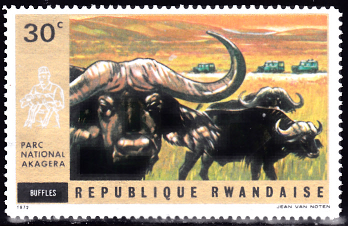 Diese Marke aus Ruanda (MiNr 488 A) zeigt Kaffernbüffel (Syncerus caffer) im Akagera-National-Park im Osten des zentralafrikanischen Staates Ruanda an der Grenze zu Tansania.