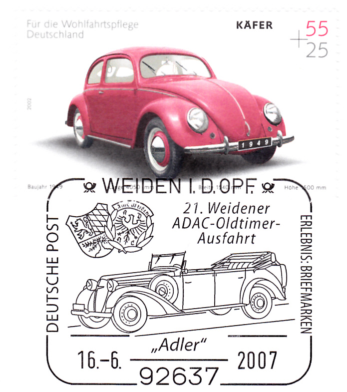 In diesem Sonderstempel aus Weiden vom 16.6.2007 zur 21. Weidener ADAC-Oldtimer-Ausfahrt ist ein Oldtimer der Adlerwerke zu sehen. Eine exakte Bestimmung des Modells ist mir bisher nicht gelungen.