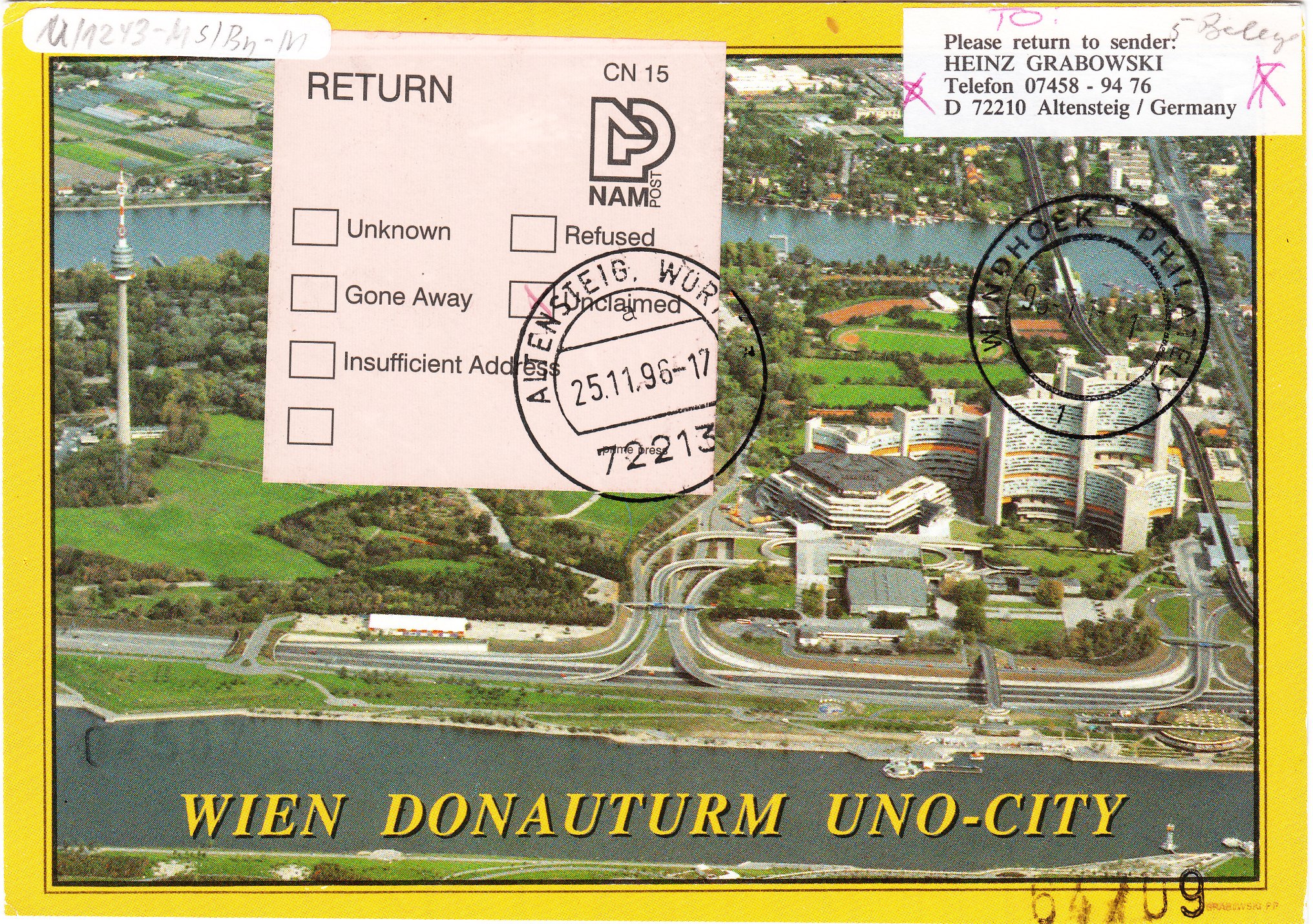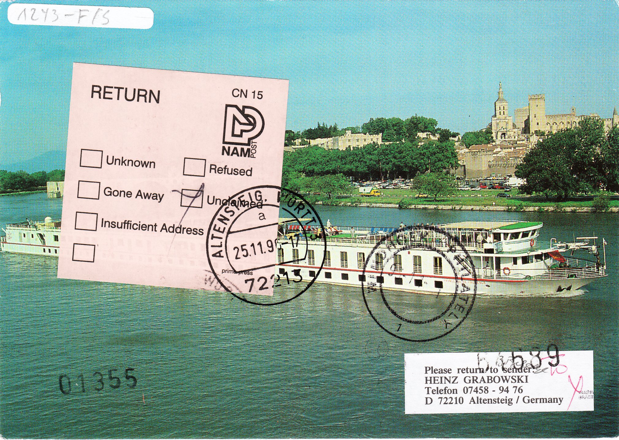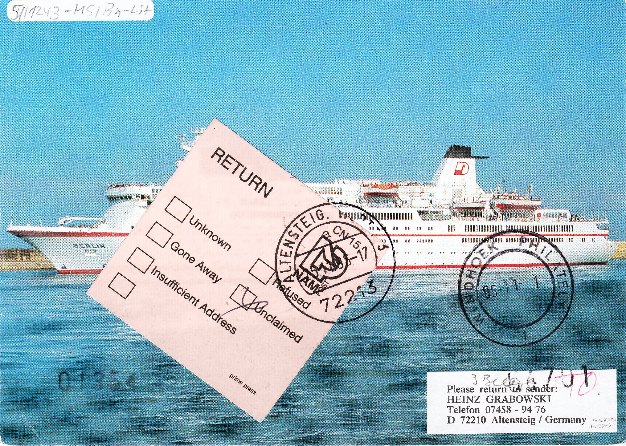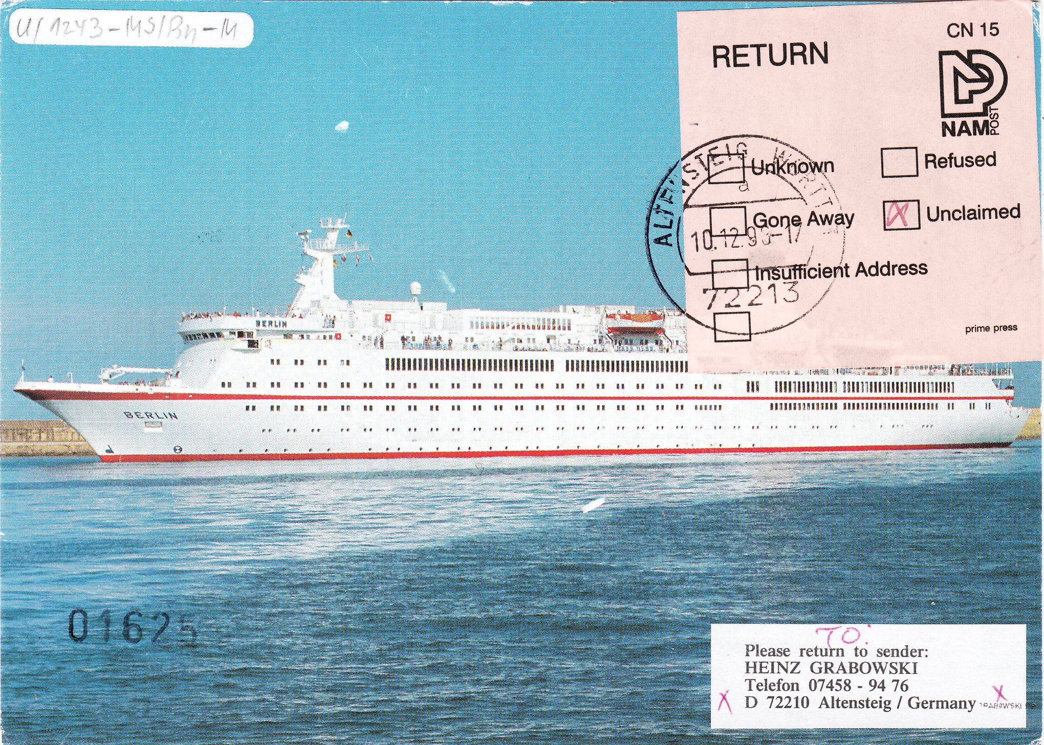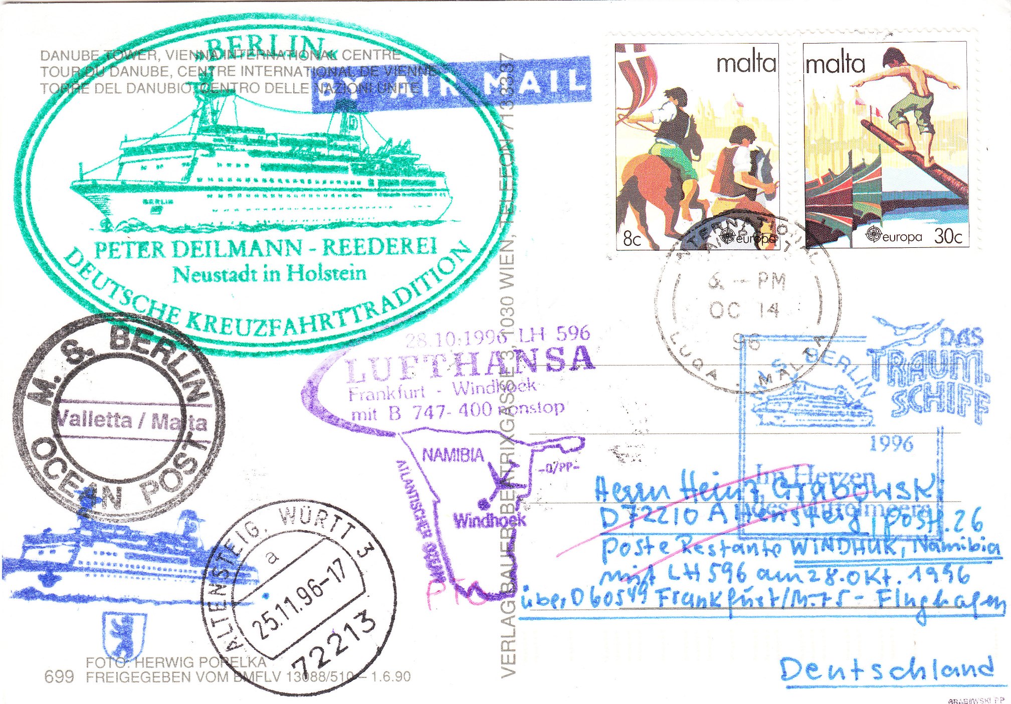Im Unterschied zu dem zuvor gezeigten Beleg trägt dieser den Bordstempel der MS BERLIN in Grün statt in Schwarz. Zusätzlich wurde bei diesem Exemplar ein weiterer Bordstempel in Blau abgeschlagen. Beim Empfänger kam der Beleg dann am 25.11.1996 an.