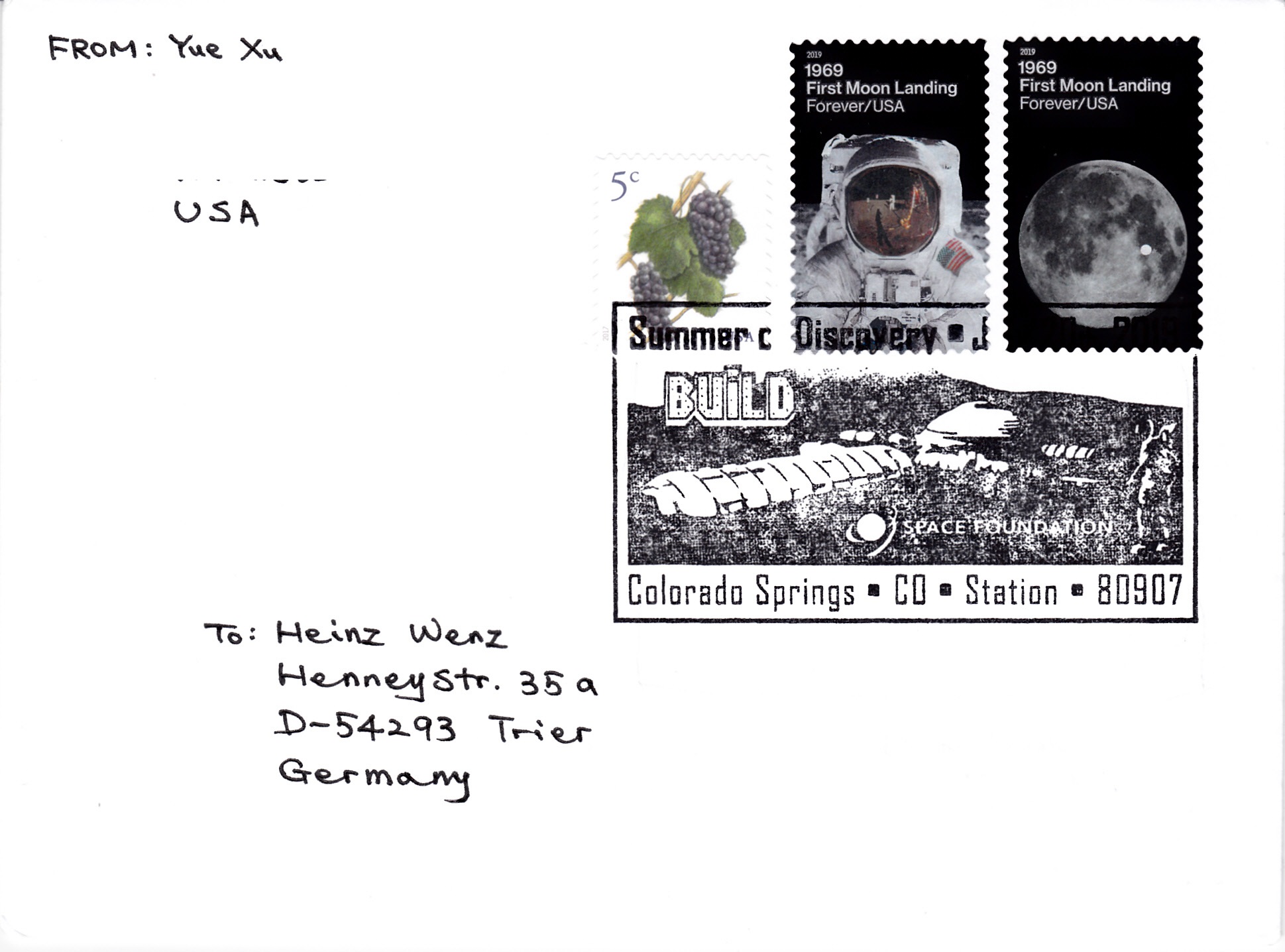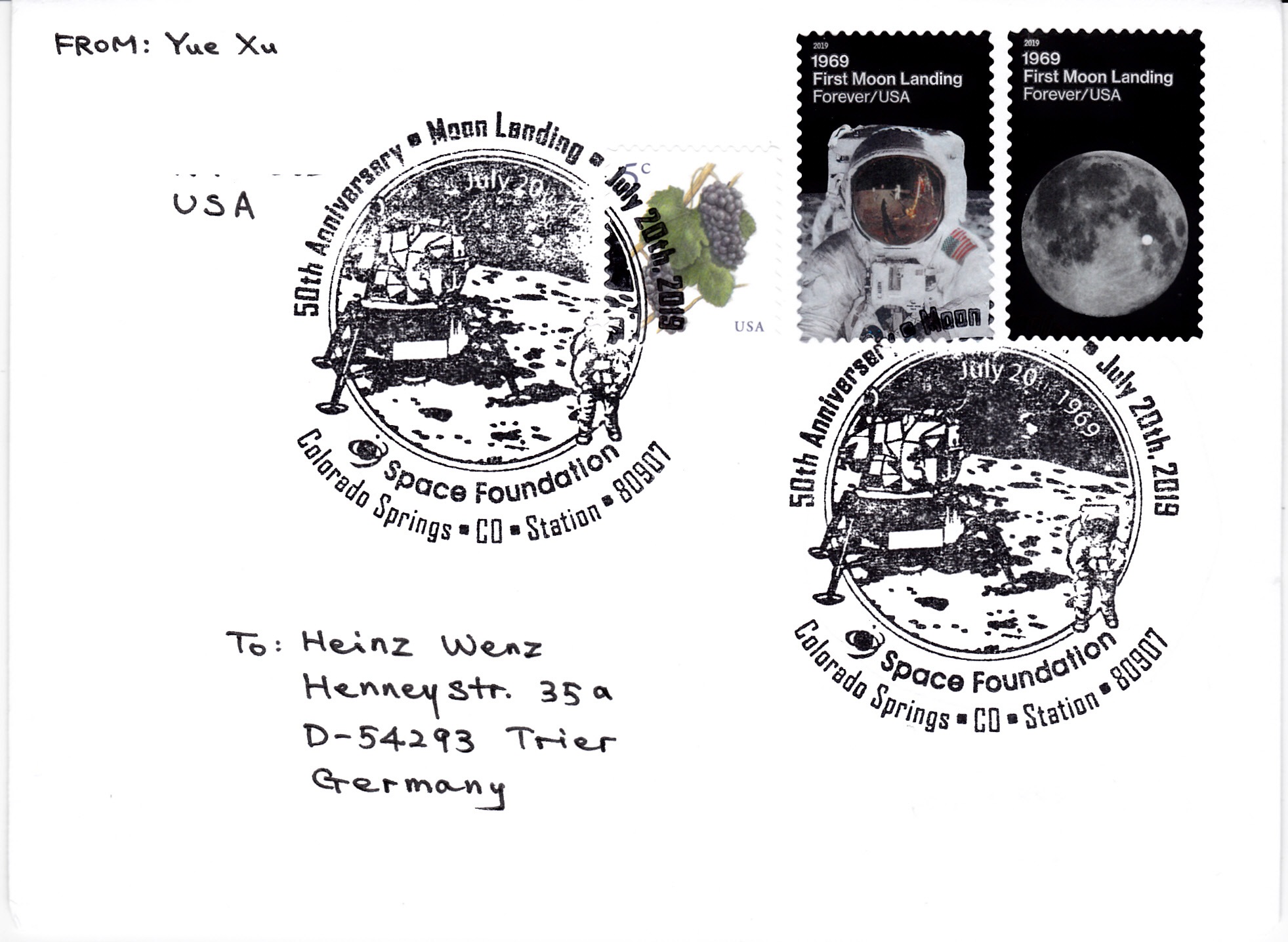 Die Space Foundation ist eine Non-Profit-Organisation, die auf "Weltraumtechnologien" und Raumfahrtmissionen aufmerksam machen möchte. Der Hauptsitz befindet sich in Colorado Springs (Colorado). Zum 50. Jahrestag der ersten bemannten Mondlandung wurde daher in Colorado Springs am 20. Juli 2019 ein Sonderstempel mit der Landefähre und einem Astronauten auf der Mondoberfläche. Zur Frankatur des Briefes wurden die beiden Marken "50 Jahre erste Mondlandung" (MiNr 5536/5537) und eine zusätzlich Marke zu 5 Cent verwendet. Der Brief ist portogerecht mit 1,15$ frankiert.