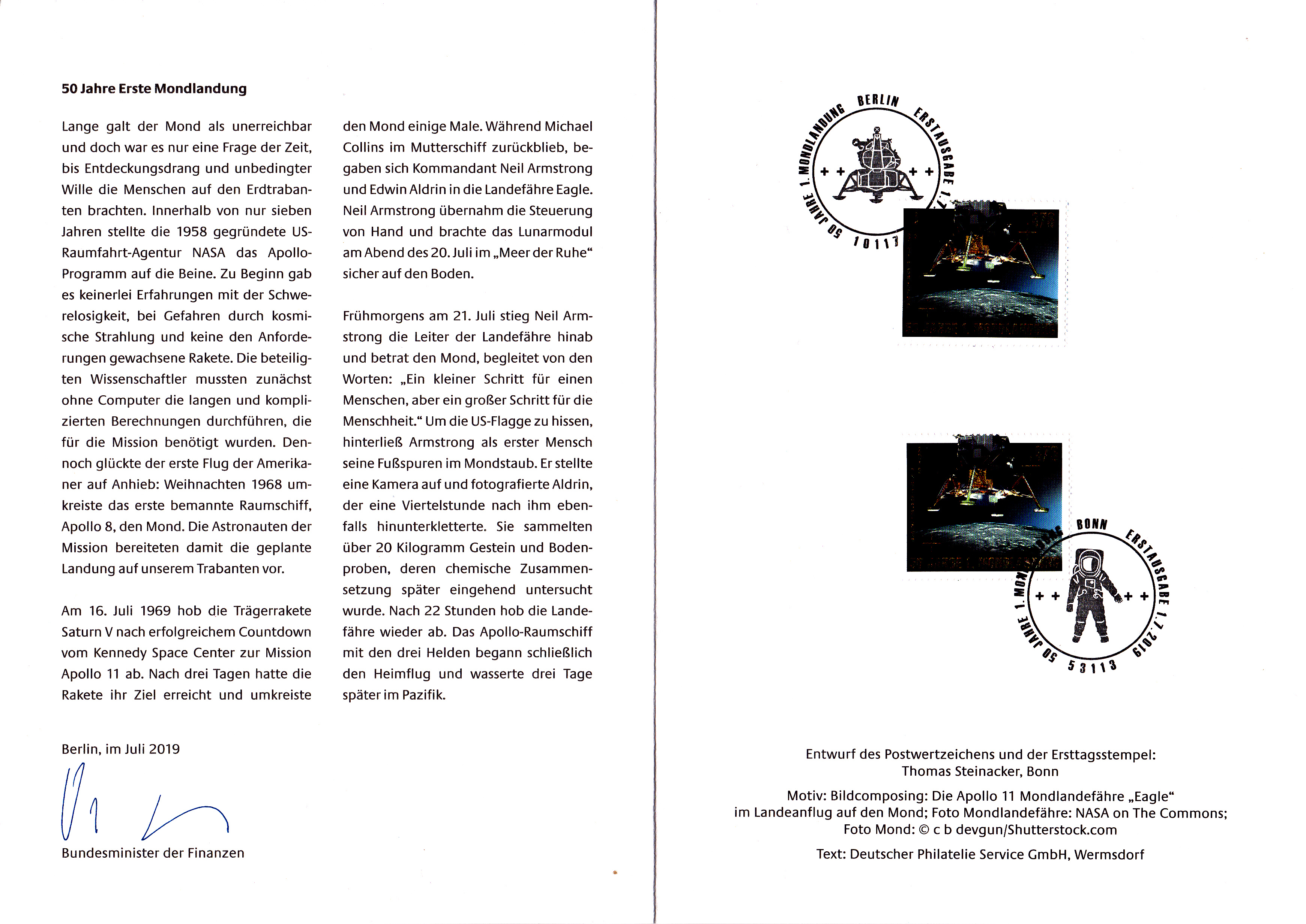 Ministerkarte des Finanzministers mit zwei Marken zum "50. Jahrestag der ersten bemannten Mondlandung" (MiNr 3479) mit den beiden Ersttagsonderstempel Bonn und Berlin.