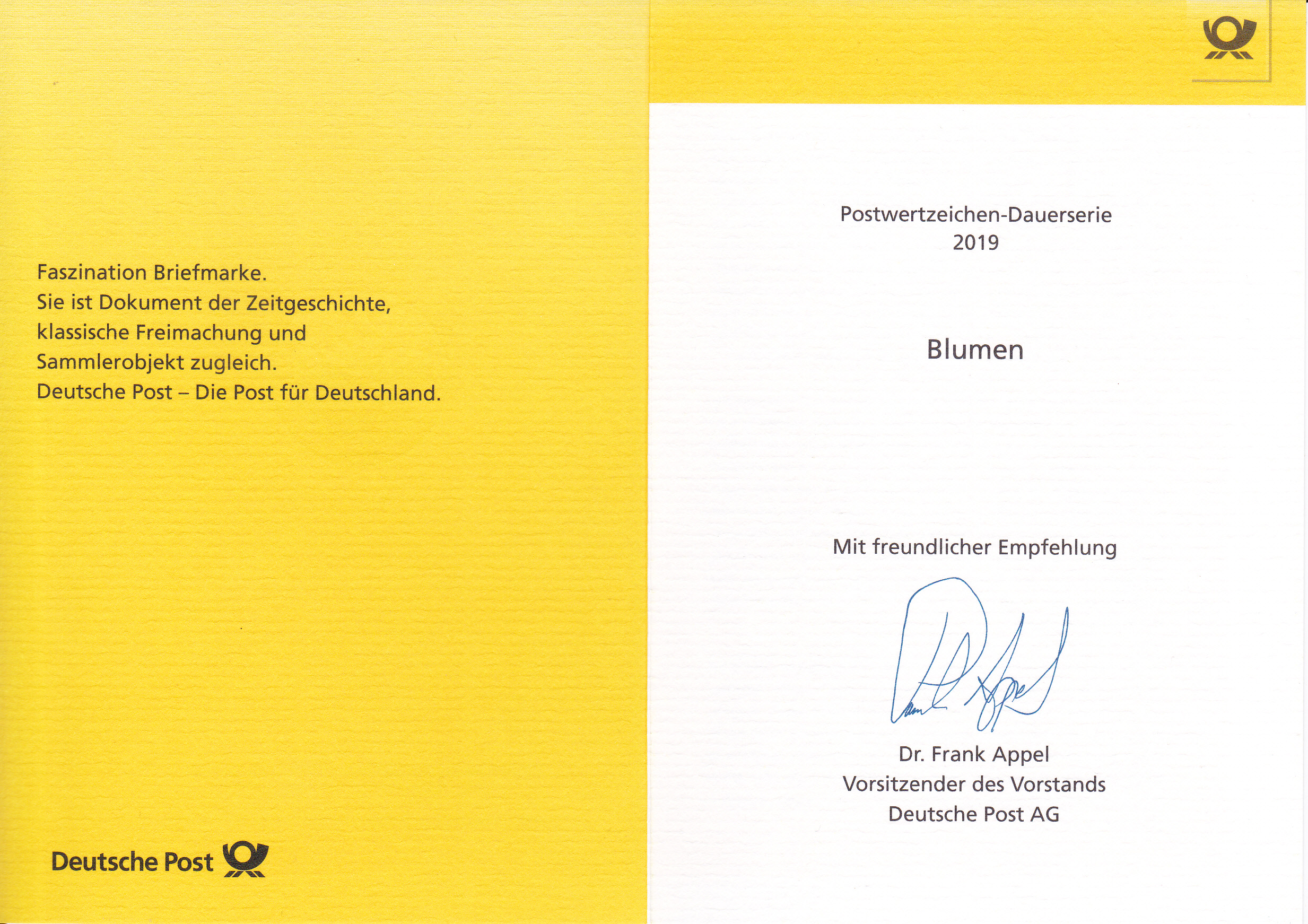 Die Klappkarten des Vorstandsvorsitzenden der Deutschen Post AG beinhalten jeweils nur eine Marke dieser Ergänzungswerte.