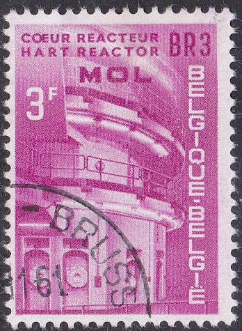 Auf dieser Marke (MiNr 1255) aus dem Jahre 1961 ist der Kernreaktor BR 2 zu sehen. Der Baubeginn für den leichtwassergekühlten Reaktor mit einer thermischen Leistung von 100 MW war am 1. Januar 1958. Er konnte am 29. Juni 1961 in Betrieb gehen.