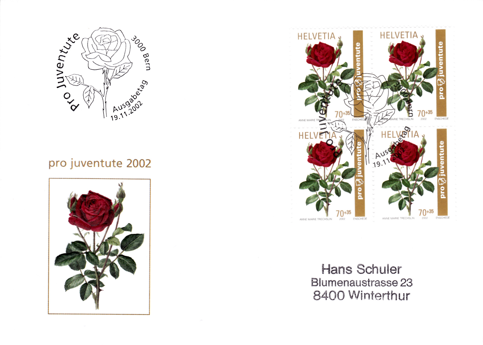 Aus der gleichen Serie kommt auch diese Marke (MiNr 1812) mit der Rose "Belle Vaudoise".