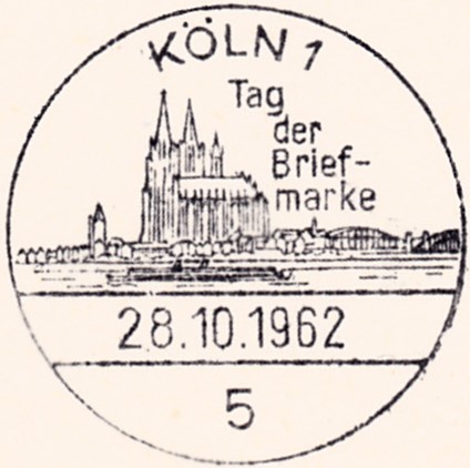 Postkarte mit dem Sonderstempel vom 28.10.1962 aus Berlin zum Tag der Briefmarke 1962 bei der BEJUBRIA (BErliner JUgend BRIefmarken Ausstellung). Im Stempelbild ist das Verbandsemblem des Ringes Deutscher Philatelisten Jugend e.V. (heute: Deutsche Philatelisten Jugend e.V.) abgebildet.