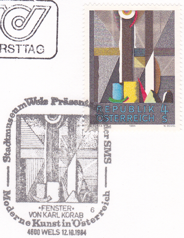 FDC mit der Marke (MiNr 1793) mit dem Gemälde "Fenster" von Karl Korab und einem Sonderstempel aus Wels mit der Kennziffer "6" zur Präsentation der Marke vom 12.10.1984 mit einer Abbildung des gleichen Gemäldes.
