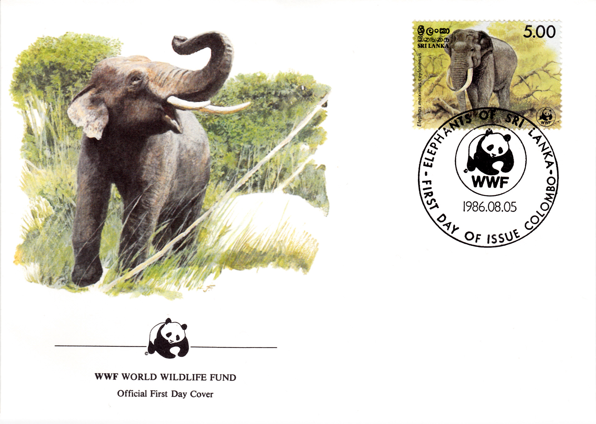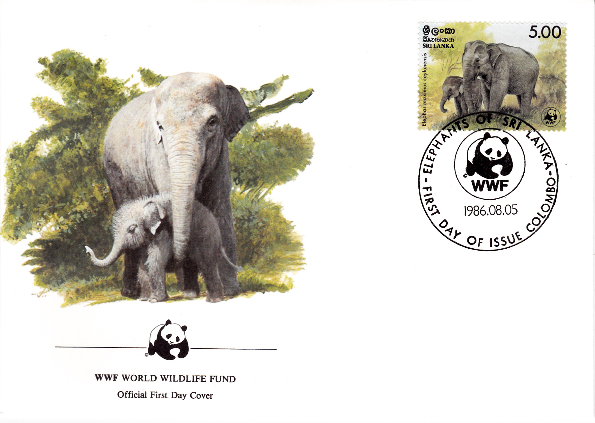 Diese Marke aus Sri Lanka (MiNr 754) zeigt eine Elefantenkuh mit einem jungen Elefanten der Unterart Sri-Lanka-Elefant (Elephas maximus maximus).