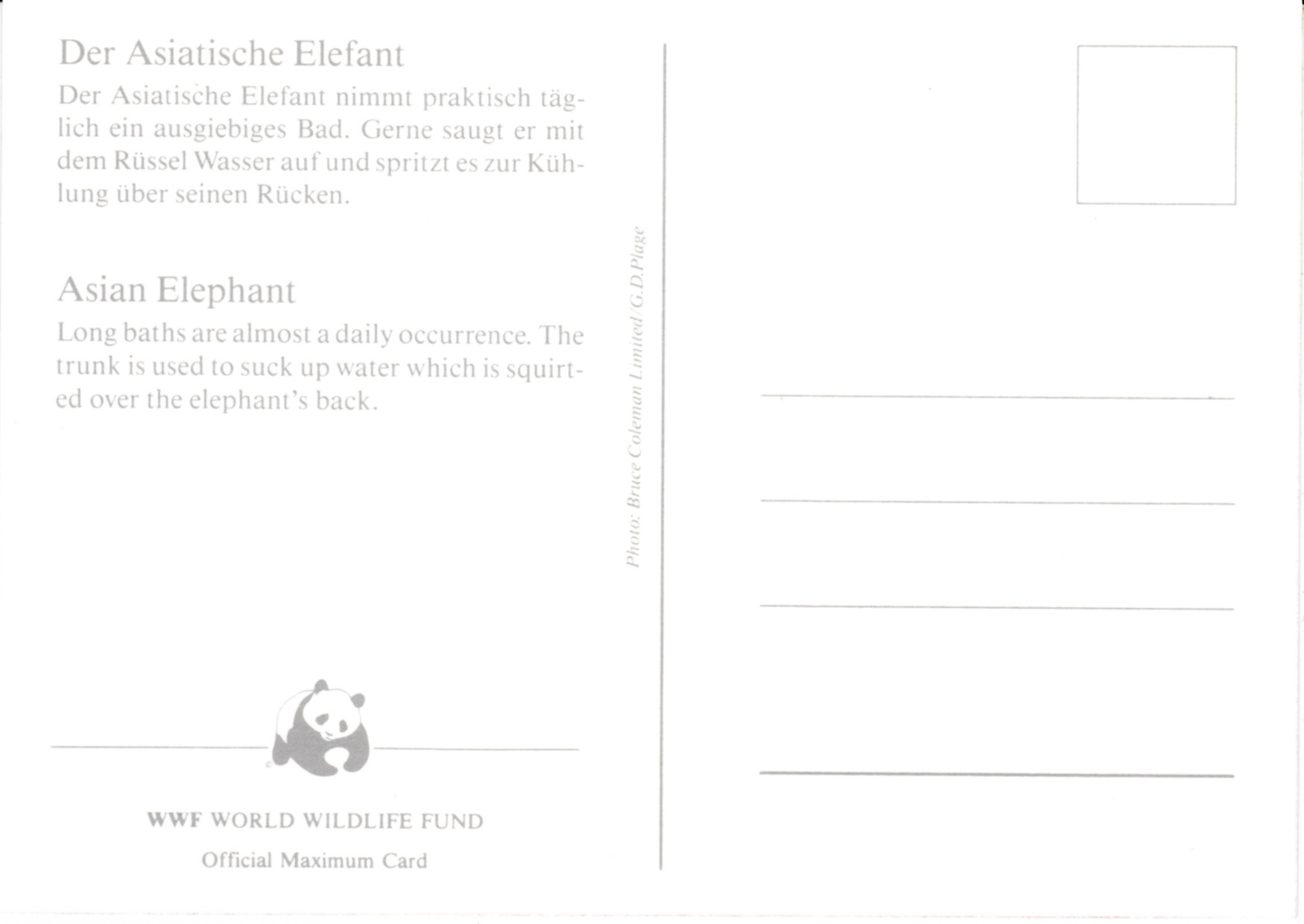Hier die ersten beiden Karten. Auf der Anschriftenseite der Karten sind jeweils kurze Texte in Deutsch und Englisch zu den Asiatischen Elefanten zu lesen.