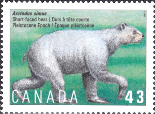 Auf einer Marke aus Kanada (MiNr 1448) ist ein Kurznasenbär (Arctodus simus) zu sehen. Im Michel wird er Kurzkopfbär (Arctodus simus) genannt.