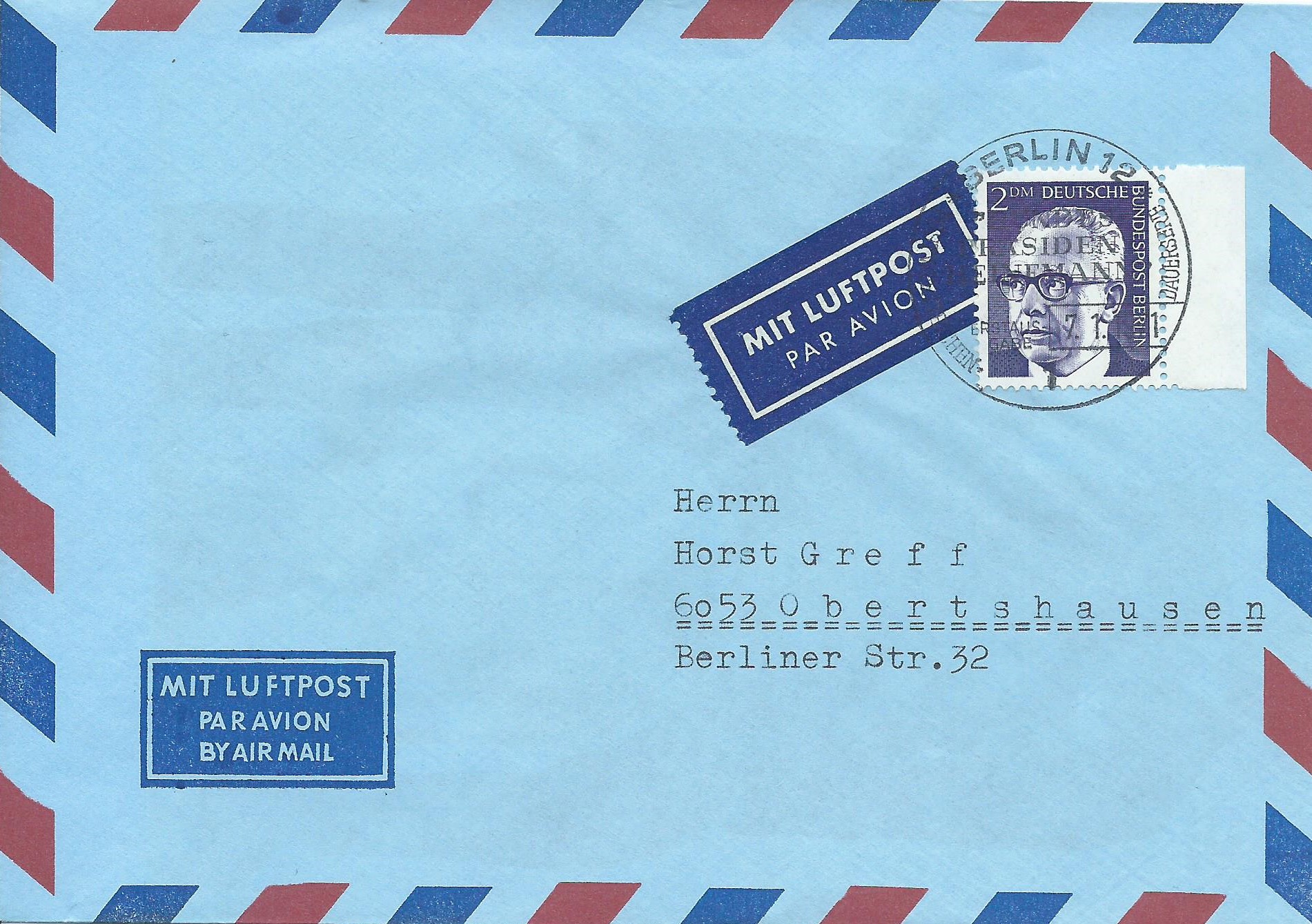 Ein Ersttagsbrief mit dem Wert zu 2 DM vom rechten Seitenrand auf einem Luftpostbrief. Gestempelt wurde am 7.1.71 mit dem Ersttagssonderstempel Berlin.