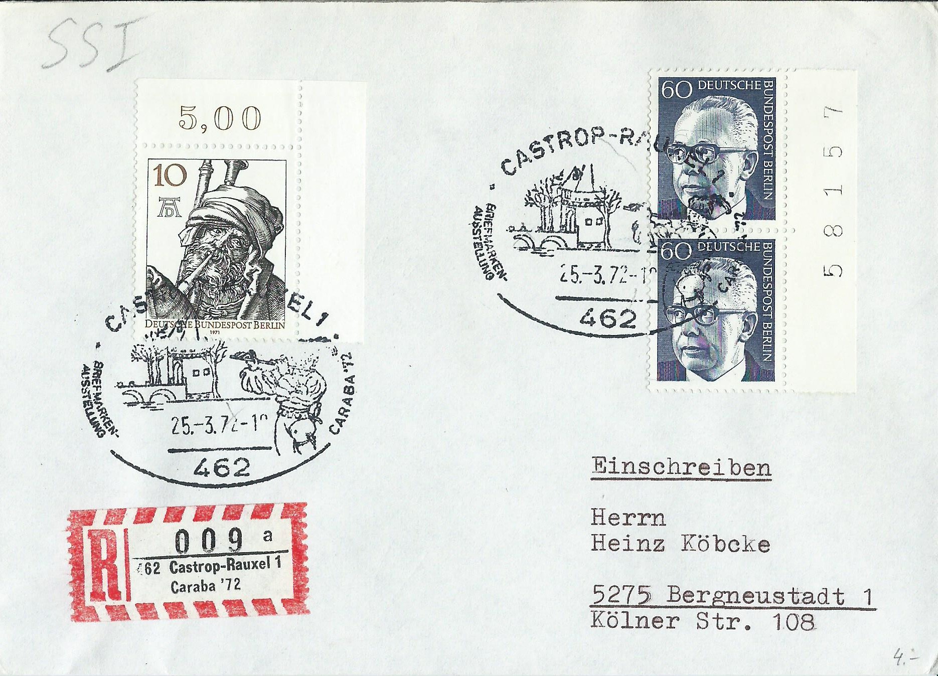Der Wert zu 60 Pf als senkrechtes Paar vom rechten Seitenrand mit Bogenzählnummer nebst einer Sondermarke zu 10 Pf als Einschreibbrief, gestempelt in Castrop-Rauxel am 25.3.72: