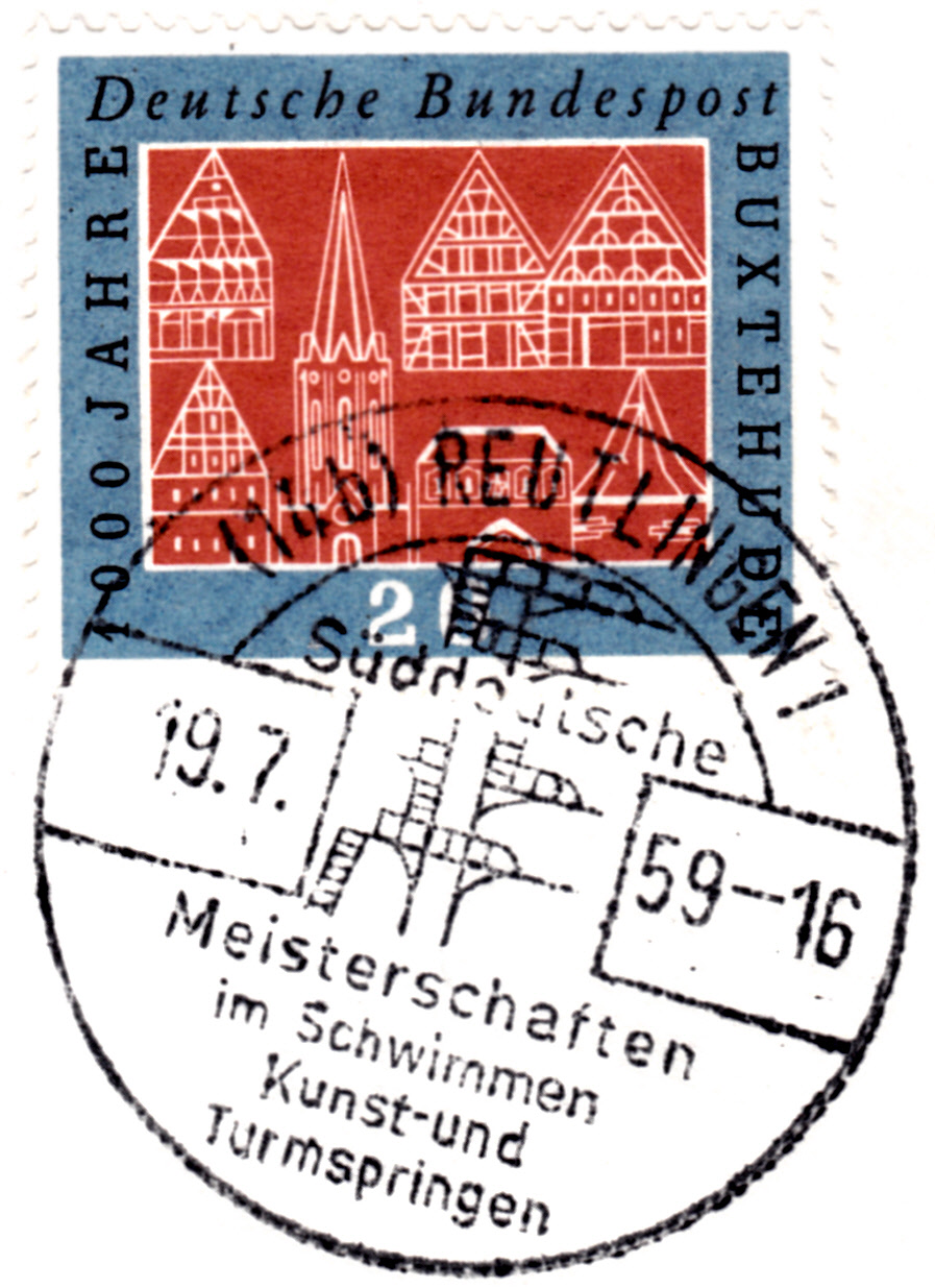 Sonderstempel vom 19.7.1959 aus Reutlingen zu den Süddeutschen Meisterschaften im Schwimmen, Kunst- und Turmspringen. Im Stempel wird ein Sprungturm gezeigt.