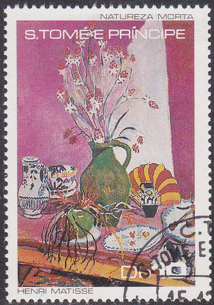 Zur 2. Internationale Briefmarkenmesse in Essen erschien in Sao Tomé und Principe eine Serie mit Gemälden aus dem Folkwang-Museum in Essen. Hier eine Marke (MiNr 516) mit einem Stillleben von Henri Matisse.