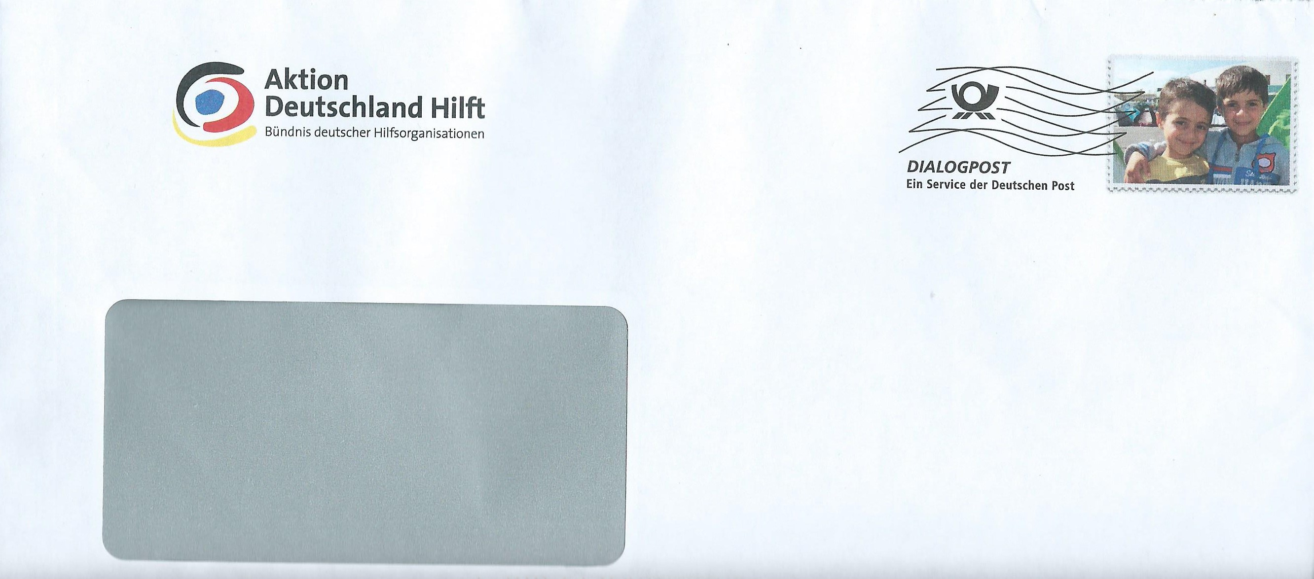 …und zum anderen von der Aktion Deutschland hilft einen Beleg mit Frankierwelle und markenähnlichem Zudruck mit 2 Kindern im Motiv: