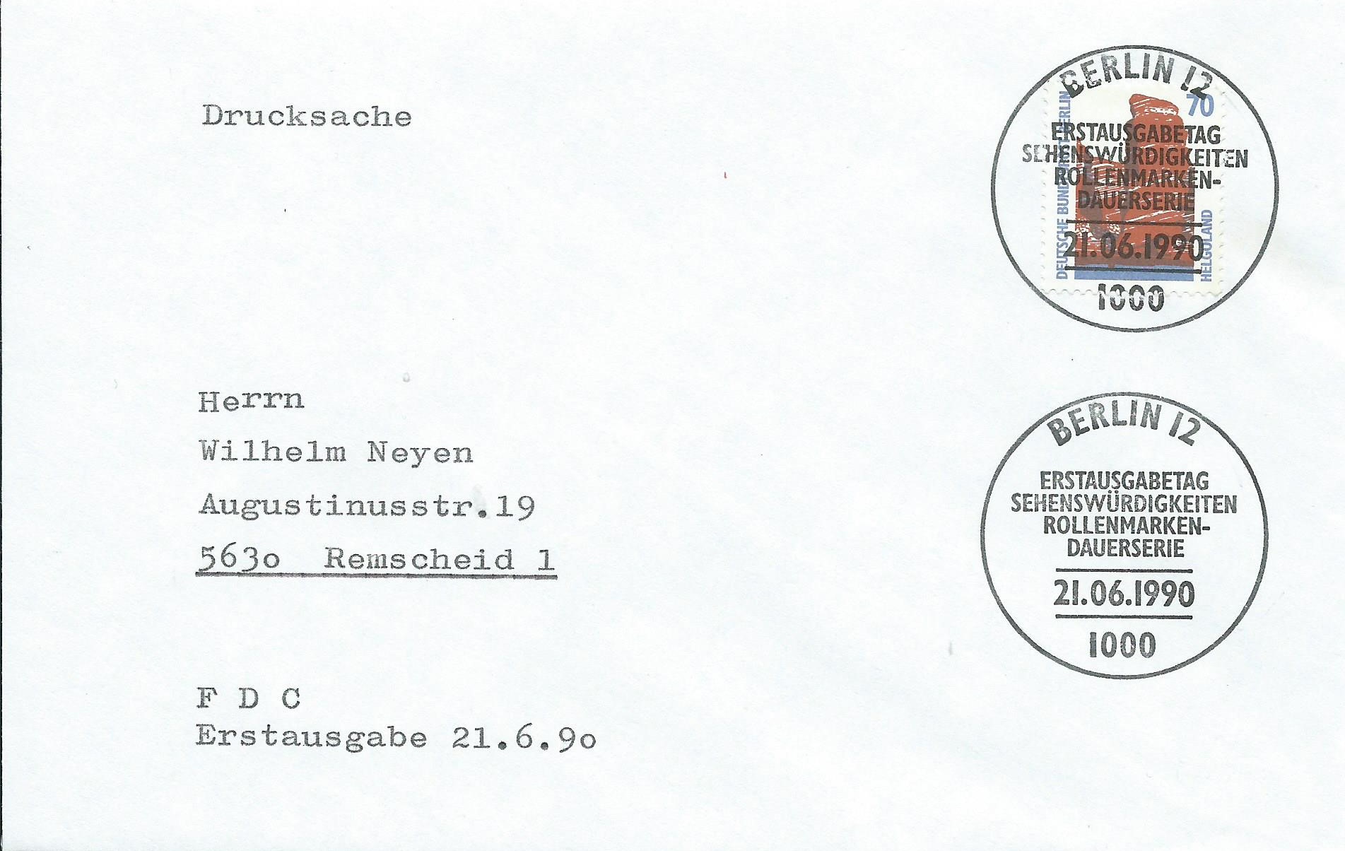 Der erste ist eine Einzelfrankatur auf einer Massenwerbesendung mit entsprechender Vorausentwertung der Absenderfirma. Das Schöne an diesem Beleg ist die Berlin-Entwertung. Aber wenn man dann auch noch auf das Datum schaut, fällt auf, dass es sogar ein Ersttagsbeleg ist! Die Marke erschien am 21.6.90 und so haben wir einen schönen Bedarfsbeleg.