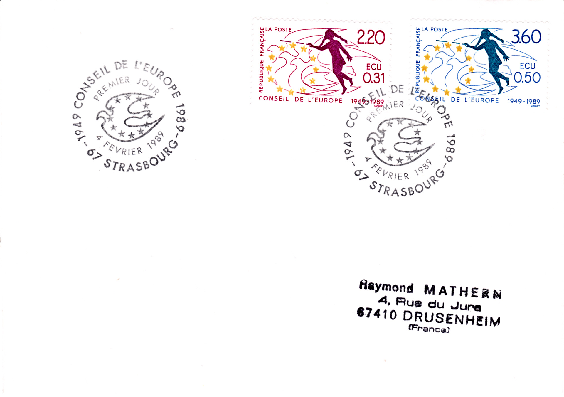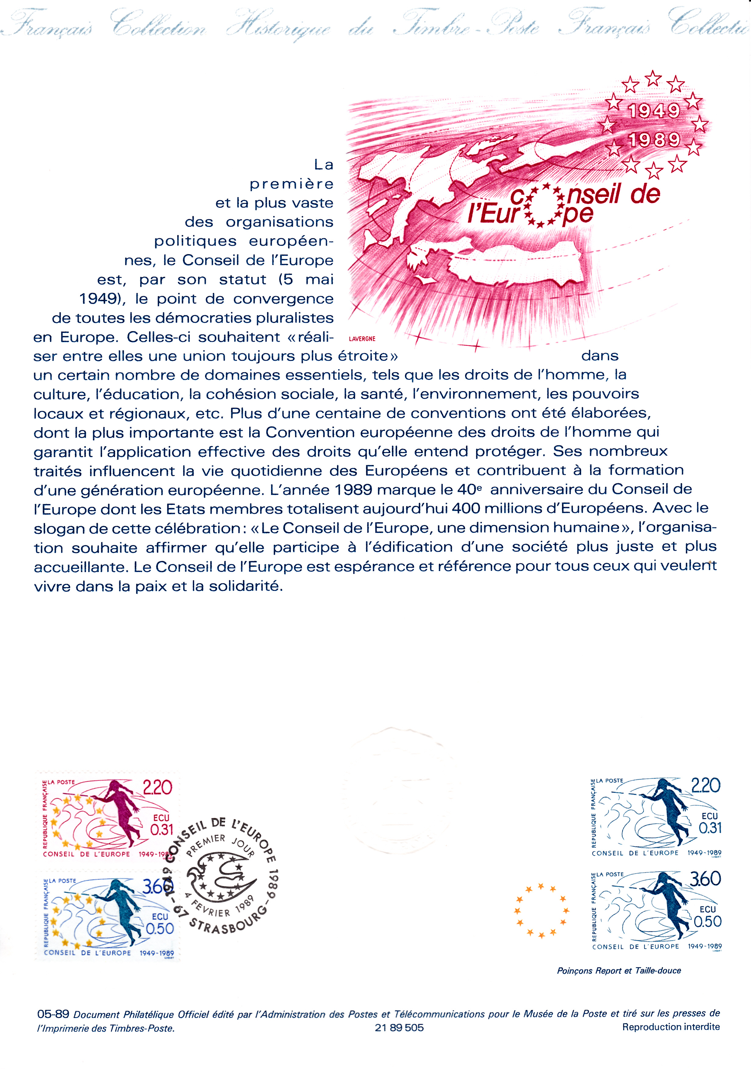 Hier zeige ich noch ein "Philatelistisches Dokument" (Document Philatelie Officiel), das von der Briefmarkendruckerei in Boulazac (nähe Perigeux) für die französische Post hergestellt und verkauft wurde. Es enthält beide Dienstmarke zum Jubiläum "40 Jahre Europarat", die mit dem Ersttagsonderstempel aus Straßburg gestempelt wurden.