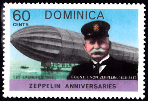 Auf Dominica ist zum Jubiläum "75 Jahre Zeppelin-Luftschiffe" diese Marke (MiNr 573) mit einer Abbildung von Zeppelin LZ 2 und seinem Erbauer Graf Zeppelin erschienen.