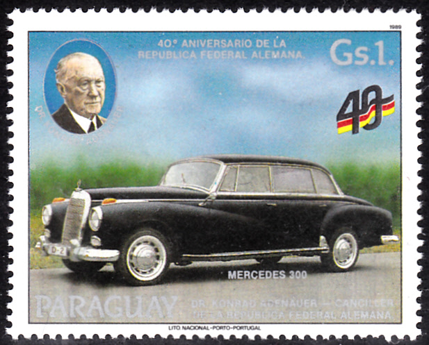 Auf dieser Marke aus Paraguay (MiNr 4352) wird der Mercedes vom Typ 300 D gezeigt, den Konrad Adenauer als Dienstwagen nutzte.