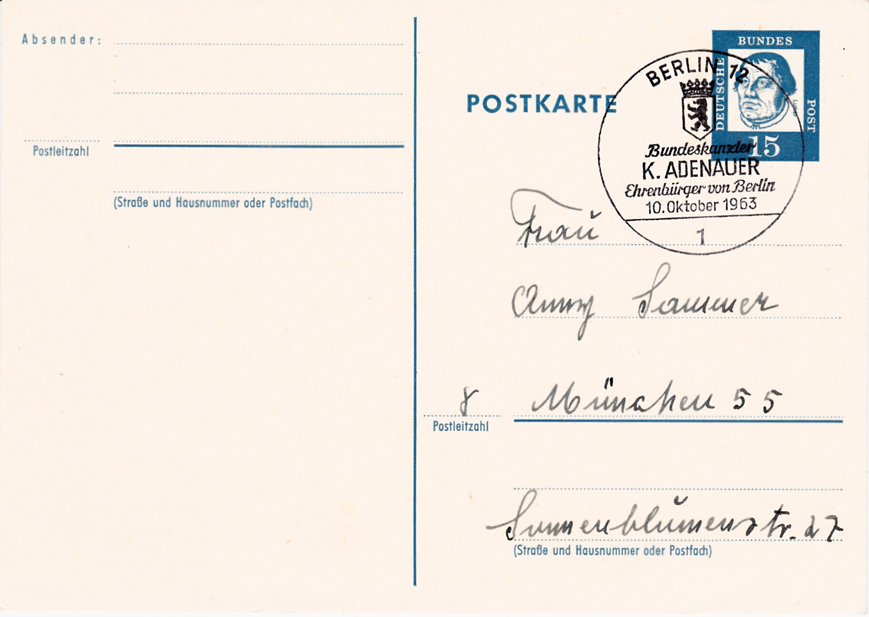 Sonderstempel vom 10. 10. 1963 aus Berlin "Bundeskanzler K. Adenauer Ehrenbürger von Berlin".