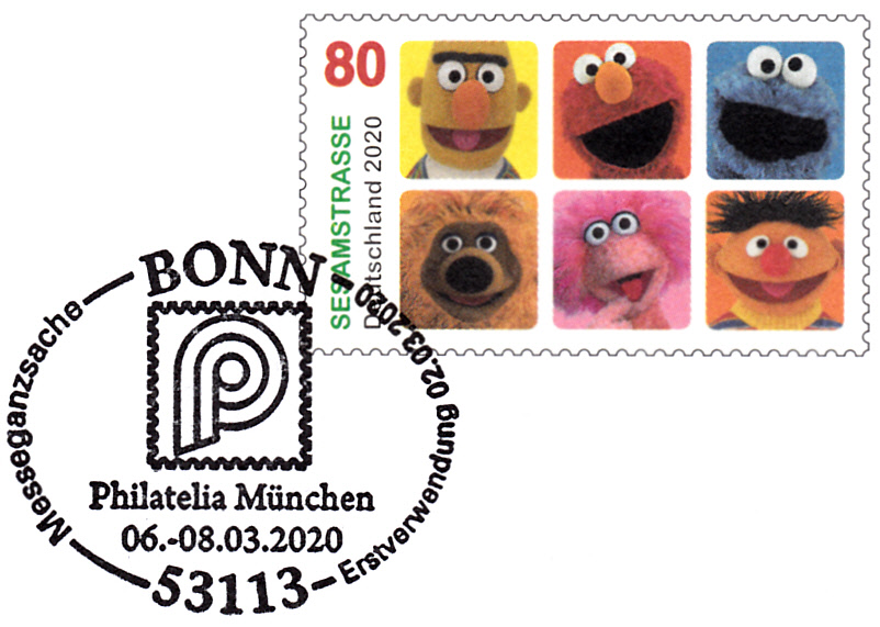 Auch zum Messeumschlag zur Philatelia in München mit dem Werteindruck der Marke "Sesamstraße" gab es in Bonn einen Erstverwendungsstempel. Er zeigt kein Motiv zur Sesamstraße, sondern das Emblem der Messe.
