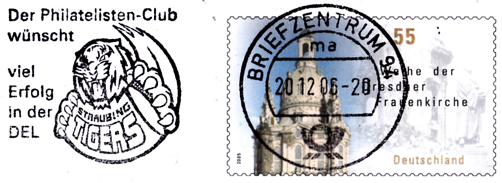 Maschinenwerbestempel vom Briefzentrum 94 vom 20.12.2006 mit dem Werbeeinsatz "Der Philatelisten-Club wünscht viel Erfolg in der DEL" (Deutsche Eishockey Liga) und dem Vereinswappen der Straubing Tigers.