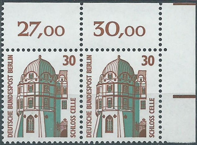 ein postfrisches waagerechtes Paar aus der rechten oberen Bogenecke zu 30 Pf mit entsprechenden Reihenwertzählern und den charakteristischen waagerechten Standstrichen im rechten Seitenrand: