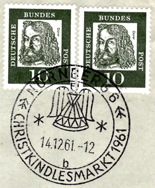 Sonderstempel vom 14.12.1961 aus Nürnberg 6 zum Christkindlesmarkt 1961 mit dem Kennbuchstaben "b". Dieser Stempel ist bis auf sie Jahreszahl motivgleich zum bereits gezeigten SST aus dem Jahre 1961.