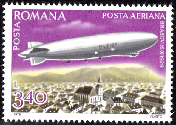 Aus Rumänien kommt diese Marke (MiNr 3503), die LZ 127 während der Balkanfahrt über Brașov zeigt.