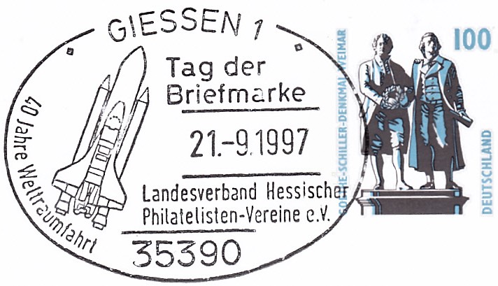Dieser Sonderstempel zum Tag der Briefmarke vom 21.9.1997 aus Gießen bildet die Weltraumrakete "Columbus" mit einem Space Shuttle ab.
