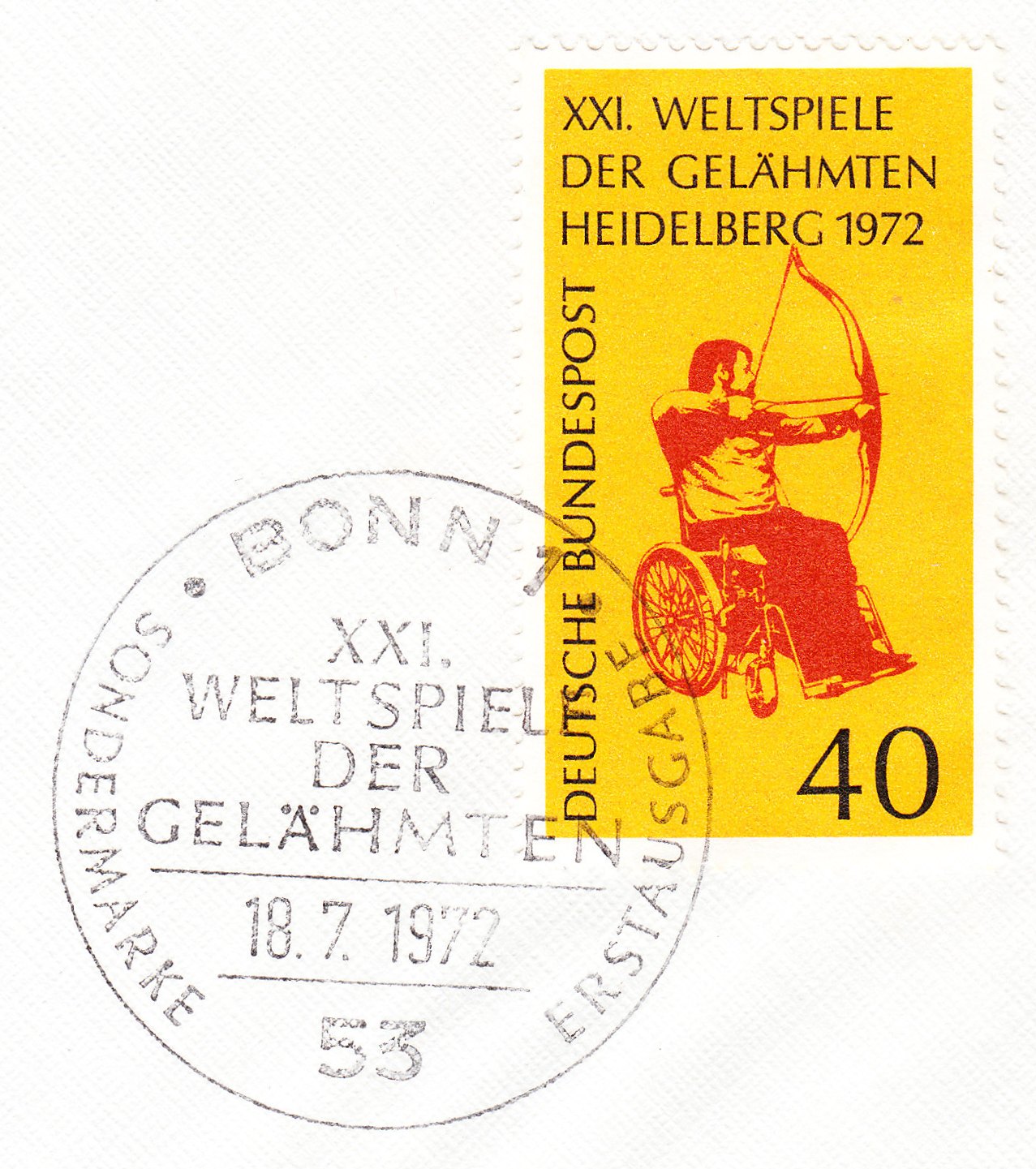 Die Deutsche Bundespost gab am 18.07.1972 die MiNr. 733 heraus, die einen Rollstuhlfahrer bei der Disziplin Bogenschießen zeigt, hier als Briefstück mit ESST Bonn: