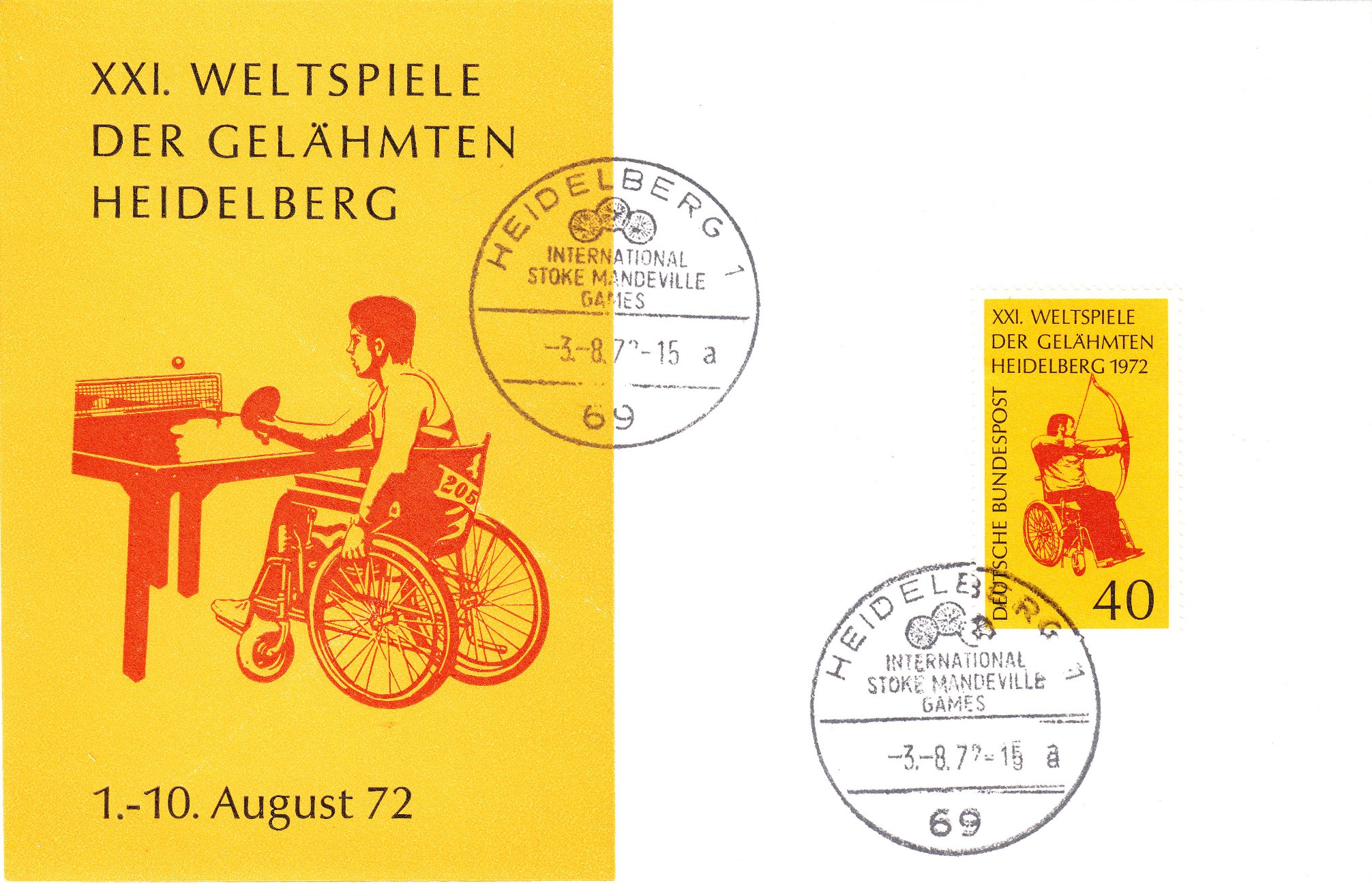 Im Jahr der Olympischen Sommerspiele von München fanden die Paralympics - damals noch unter dem Namen "XXI. Weltspiele der Gelähmten / International Stoke Mandeville Games" - vom 1. bis zum 10. August 1972 in Heidelberg statt.