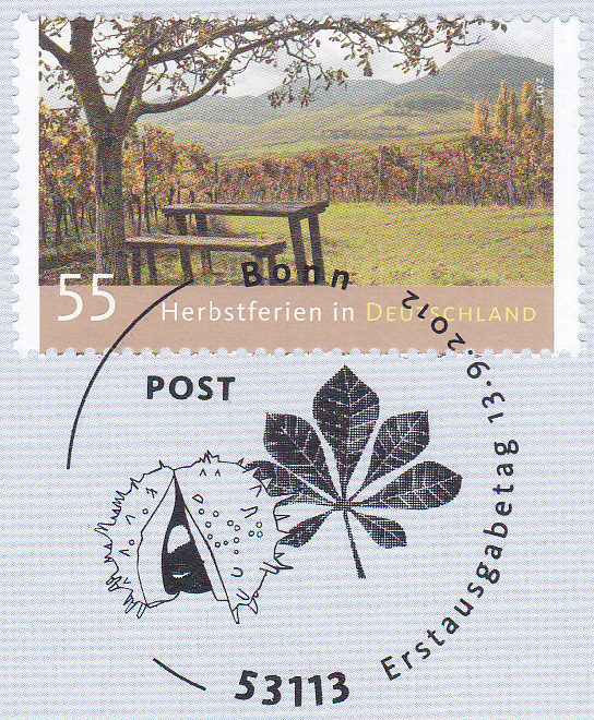 Im Stempelbild des Ersttagsonderstempel Bonn vom 13.9.2012 zur Marke "Herbstferien" (MiNr 2953) werden ein Blatt und eine Frucht der Rosskastanie gezeigt.