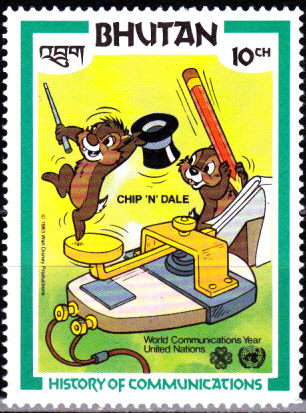Bhutan verausgabte am 10. April 1984 zum Weltkommunikationsjahr eine Briefmarkenserie mit Walt-Disney-Figuren. Auf der hier gezeigten Marke (MiNr 831) aus dieser Serie sehen wir Ahörnchen und Bhörnchen mit einem Morsegerät.