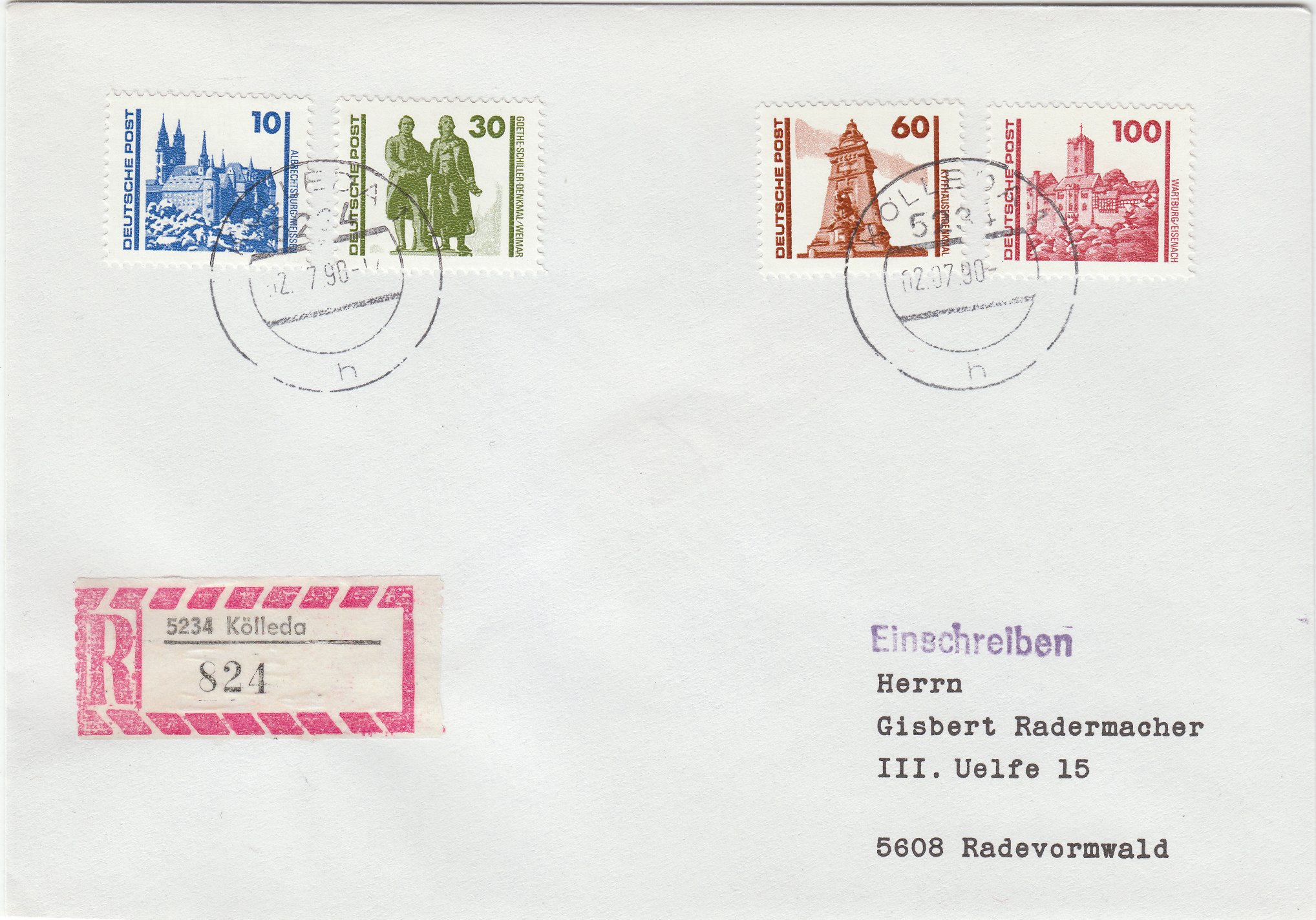 Auch dieser Brief kann nur von einem Briefmarkensammler stammen, mit Einführung der DM wurde bei allen Selbstbedienungs-Einschreibe-Automaten der Geldeinwurf verklebt, so das ein SB-Einschreiben nicht mehr möglich war. Trotzdem wurden die entrichteten 50 Pfg (-Ost) bei diesem Beleg anerkannt, da ja auch die DDR-Marken noch frankaturgültig waren.
