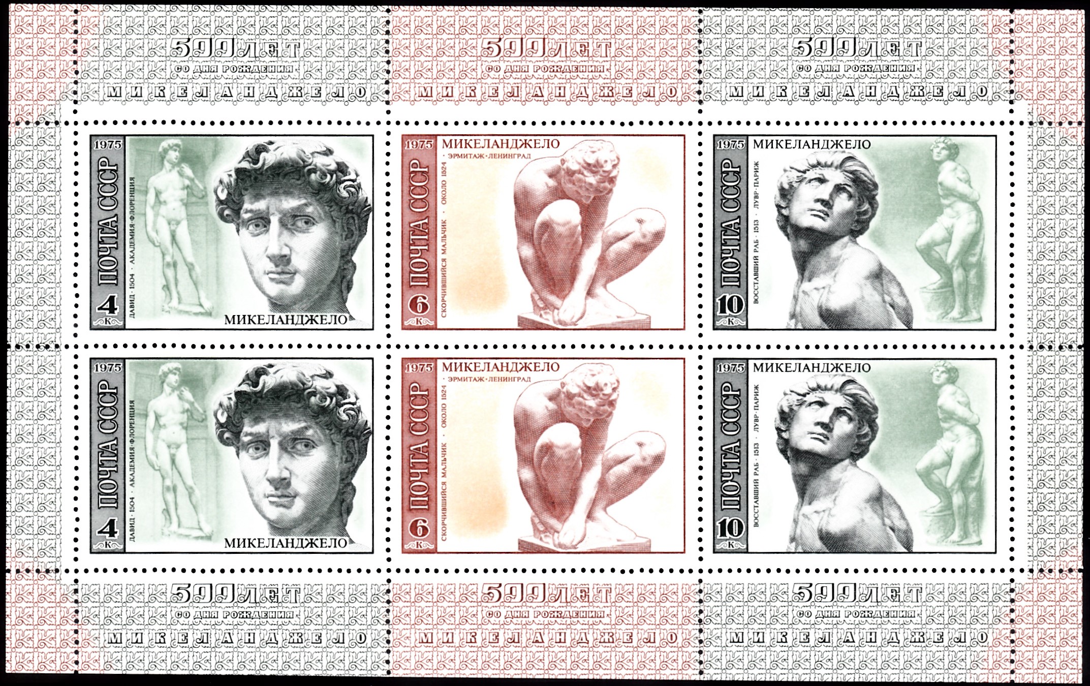 Zum 500. Geburtstag von Michelangelo ist in einer Serien in der Sowjetunion diese Marke (MiNr 4329) mit der Skulptur "David" und dem Detail des Kopfes von David erschienen.