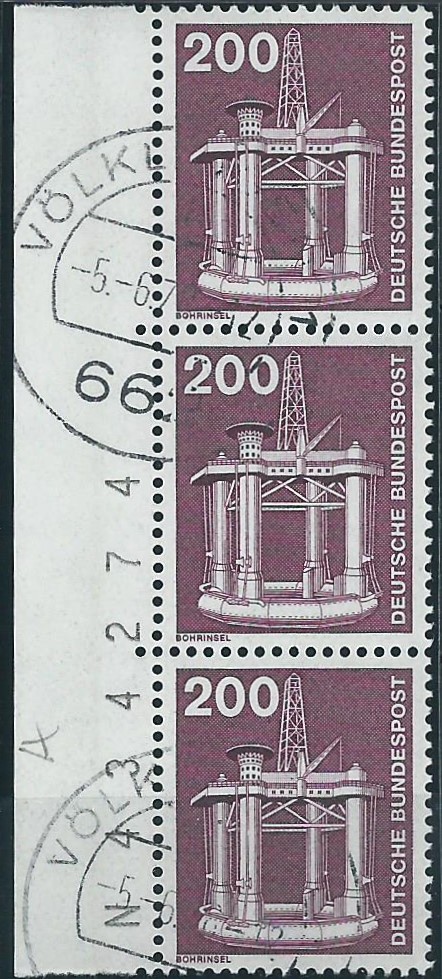 Der Wert zu 200 Pf im senkrechten 3-er-Streifen vom linken Bogenrand und 6-stelligem Bogenzähler mit vorangestelltem Buchstaben N. Gestempelt wurde mit einem Tagesstempel Völklingen am 5.6.78: