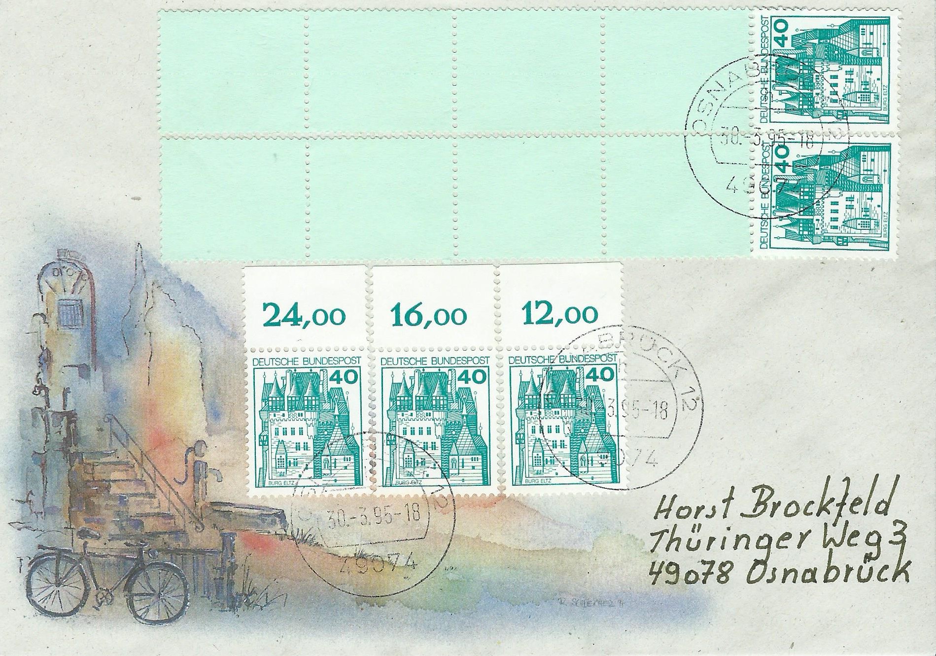 Dann ein Brief mit 2 Rollenenden 1 + 4 der Marke zu 40 Pf, dazu noch 3 Marken vom Oberrand mit Reihenwertzähler 12,00, 16,00 und 24,00. Gestempelt wurde in Osnabrück am 30.3.95.