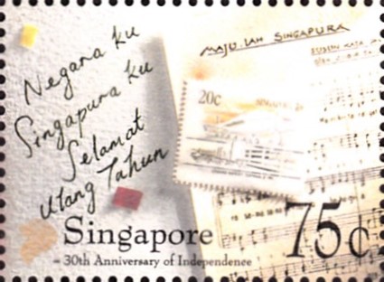 Zum Thema "30 Jahre Unabhängigkeit" erschien in Singapur eine Markenausgabe bestehend aus vier Marken und einem Block.