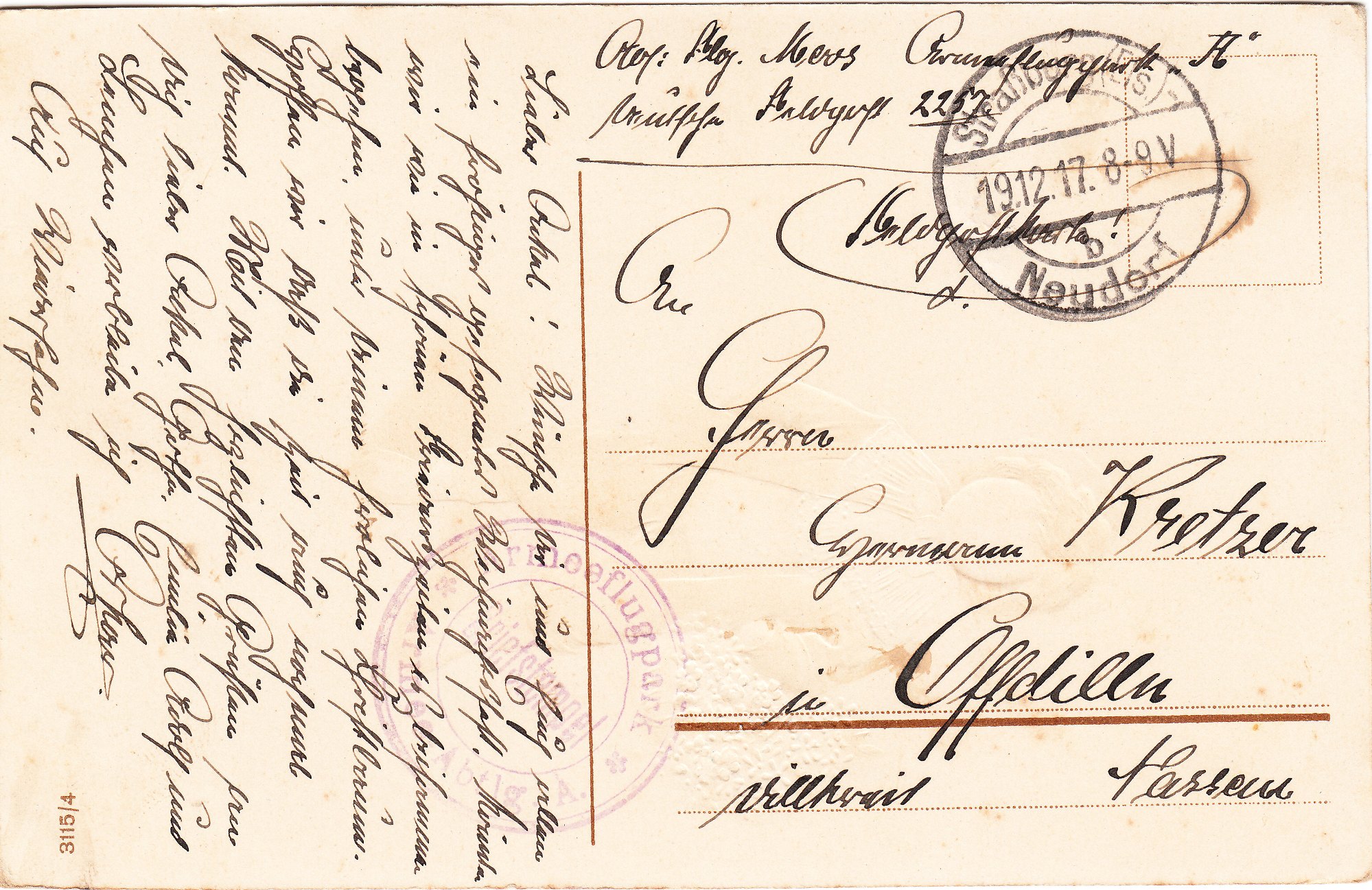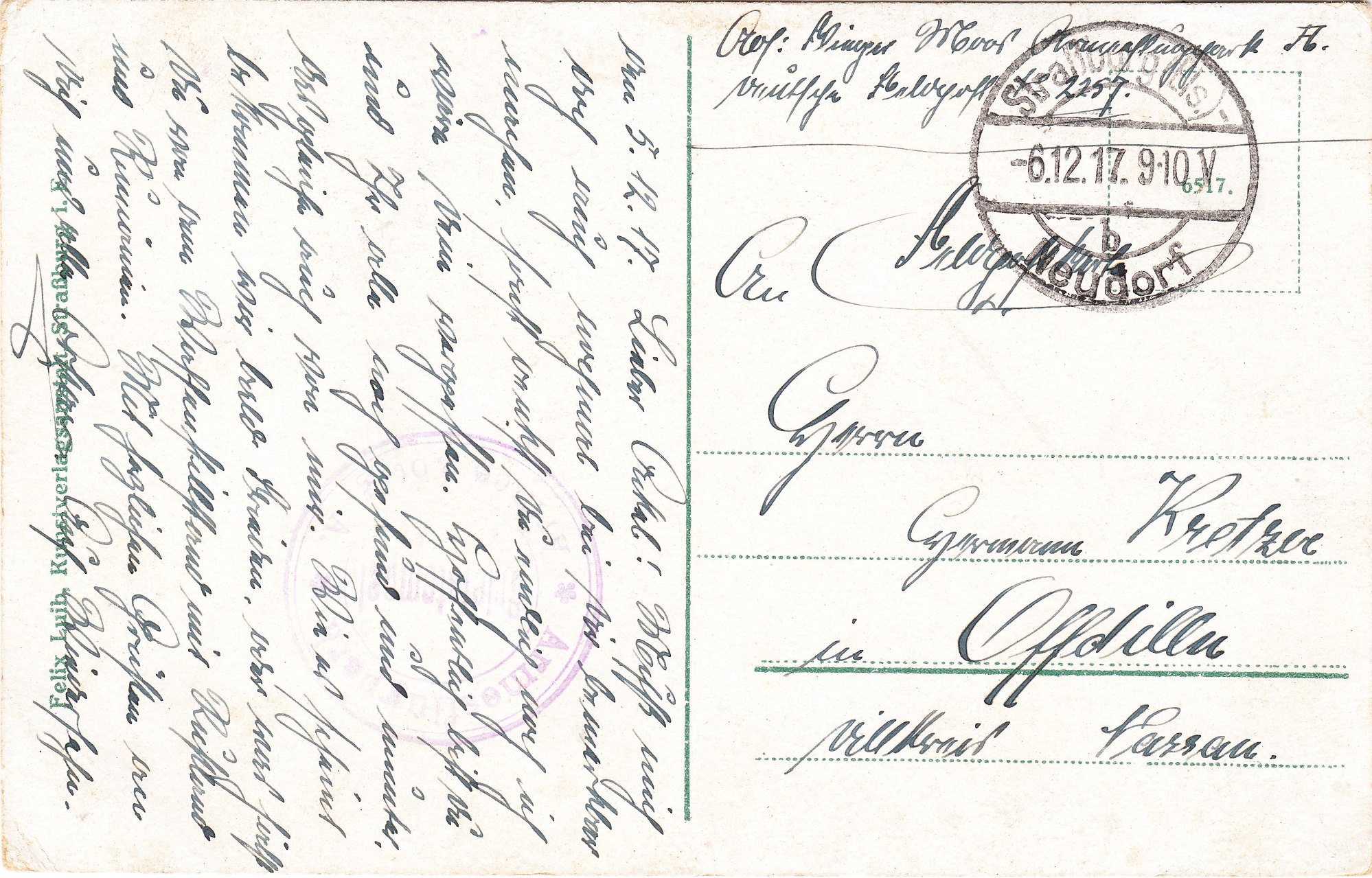 Diese Ansichtskarten wurden am 06.12.1917 bzw. 19.12.1917 vom Absender "Flieger Moos Armeeflugpark A. Deutsche Feldpost 2257" aufgegeben und erhielten zunächst einen Truppenstempel als Briefstempel "Armeeflugpark Armee Abtlg A." und dann einen Tagesstempel Straßburg-Neudorf: