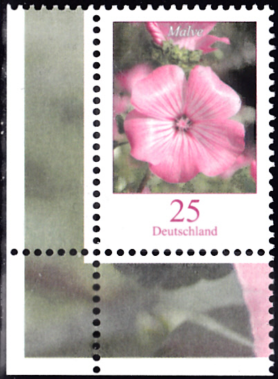 In der Dauerserie "Blumen" der Deutschen Post ist auch eine Marke (MiNr 2462) mit der Blüte einer Bechermalve (Lavatera trimestris) erschienen. Hier zeige ich ein Eckrandstück dieser Marke.