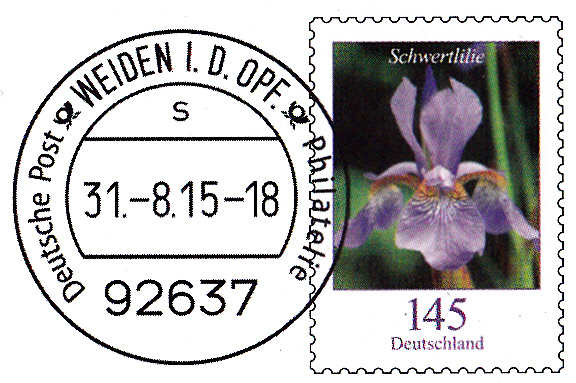 Diese Broschüre im Format 235 x 152 mm (unten geheftet) hat einen Wertstempel mit der 145 Cent Marke "Schwertlilie" aus der Bauerserie "Blumen". Die Vorausentwertung hat das Datum "31.-8.15-18".