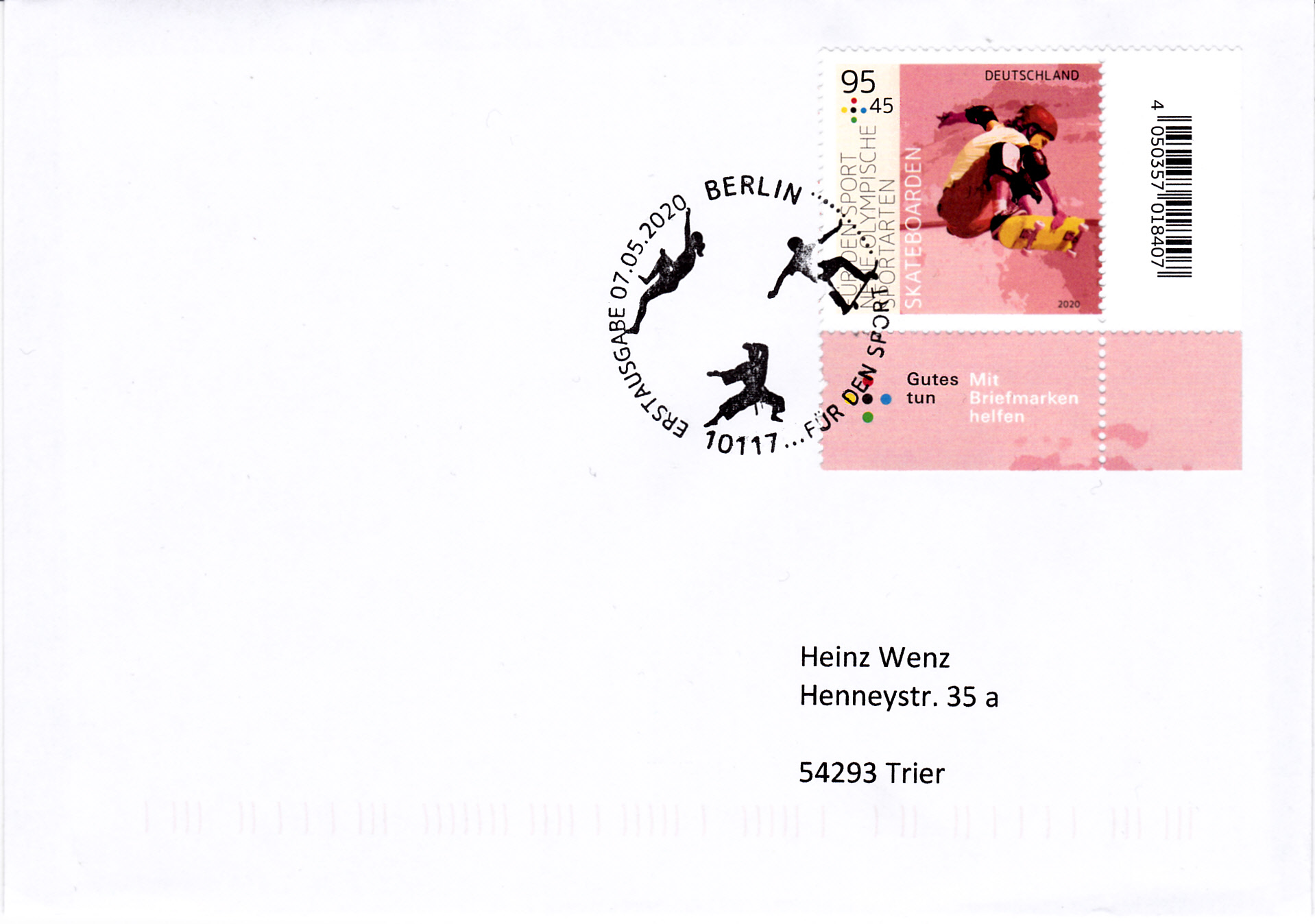 Brief vom Ersttag mit der Marke (MiNr 3543) zur neuen olympischen Sportart Skateboarden mit dem Ersttagsonderstempel aus Berlin. Auch in diesem Stempel wird ein Skateboarder gezeigt.