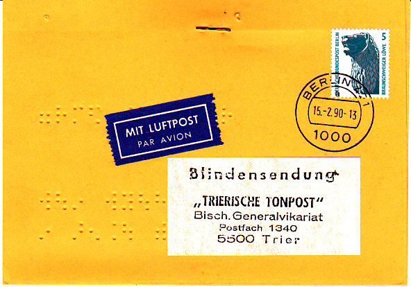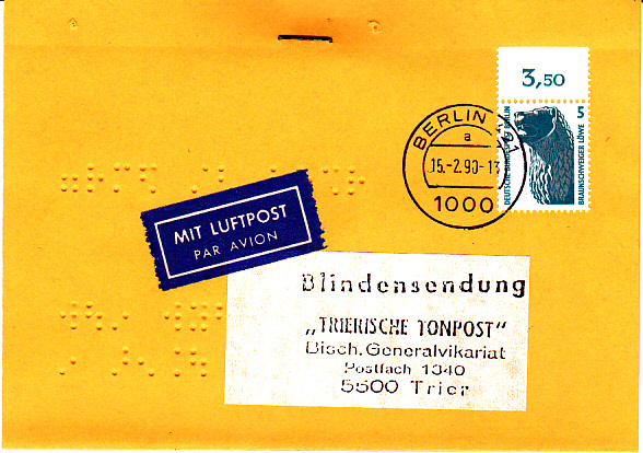 Einzelfrankatur des 5 Pfennigwertes der Dauerserie SWK (hier eine Bogenmarke vom Oberrand) zur Entrichtung des von Berlin in die Bundesrepublik geltenden Luftpostzuschlags bei einer portofreien Blindensendung, portogerecht vom Ersttag 15.02.1990 mit Tagesstempel Berlin 421.